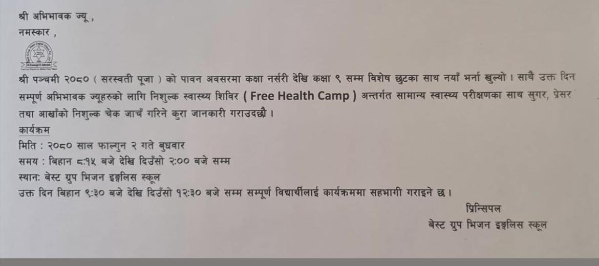 श्रीपञ्चमीका दिन अर्थात फागुन २ गते अक्षरारम्भ गराउन चाहने अभिभावकहरूले विशेष छुटका साथ आफ्ना बालबालिकालाई विद्यालयमा भर्ना गराउन सकिने विद्यालयले जनाएको छ । साथै सरस्वती पूजाको अवसरमा सम्पूर्ण अभिभावकहरुका लागि निशुल्क स्वास्थ्य शिविर समेत आयोजना गर्ने भएको छ । सामान्य स्वास्थ्य परीक्षणमा सुगर, प्रेसर तथा आँखाको निशुल्क चेकजाँच गरिने विद्यालयले जनाएको छ । विहान ८ बजे १५ मिनेटदेखि दिउँसो २ बजेसम्म कार्यक्रमम आयोजना गरिने विद्यालयका संस्थापक सुनिल केसी खत्रीले जानकारी दिनुभयो । कार्यक्रम स्कुल प्राङगणमा गरिनेछ ।
