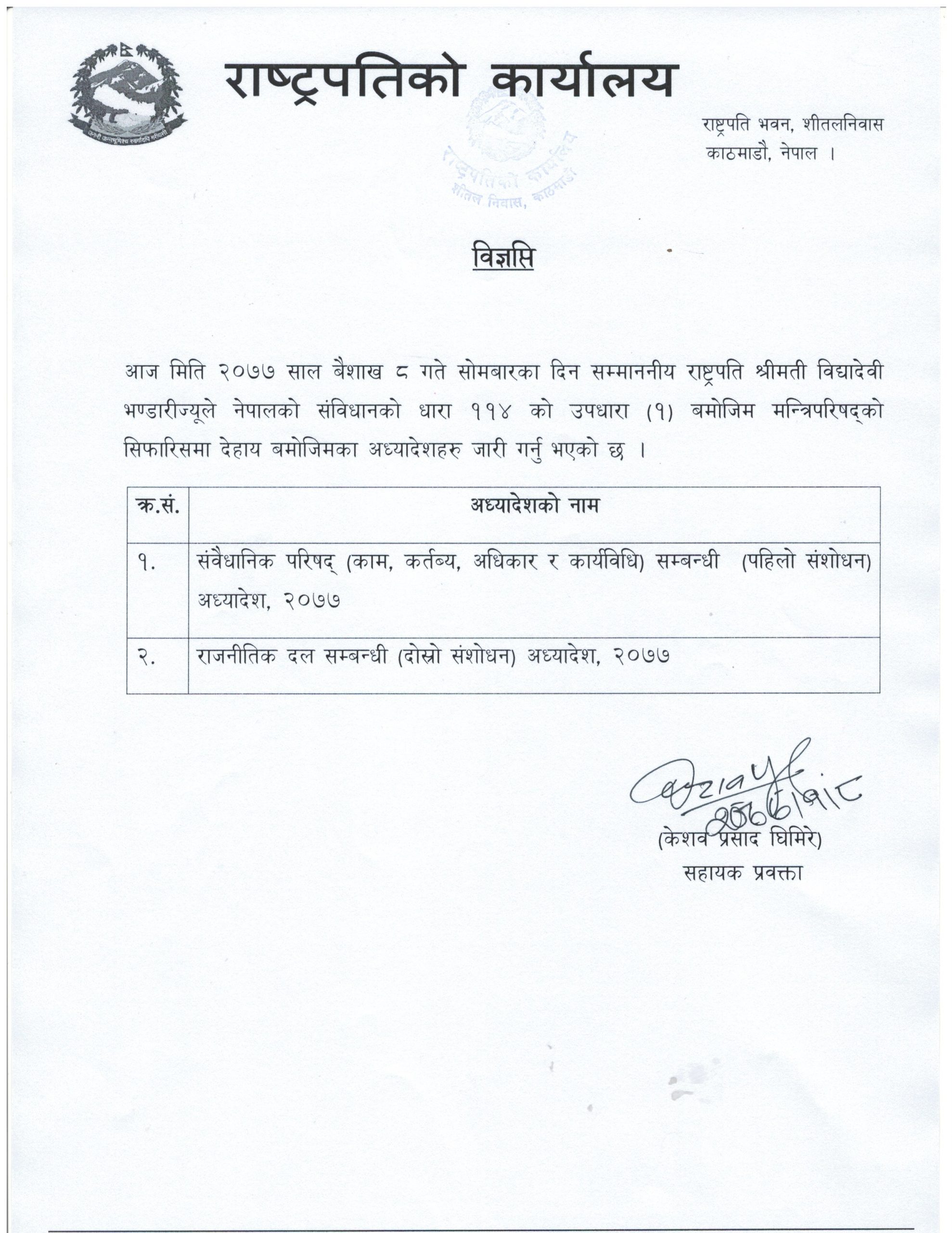 मन्त्रिपरिषद्को सिफारिसमा राजनीतिक दलसम्बन्धी (दोस्रो संशोधन) अध्यादेश र संवैधानिक परिषद् (काम, कर्तव्य, अधिकार र कार्यविधि) सम्बन्धी (पहिलो संशोधन) अध्यादेश, २०७७ लाई राष्ट्रपति भण्डारीले प्रमाणीकरण गरेकी हुन् ।