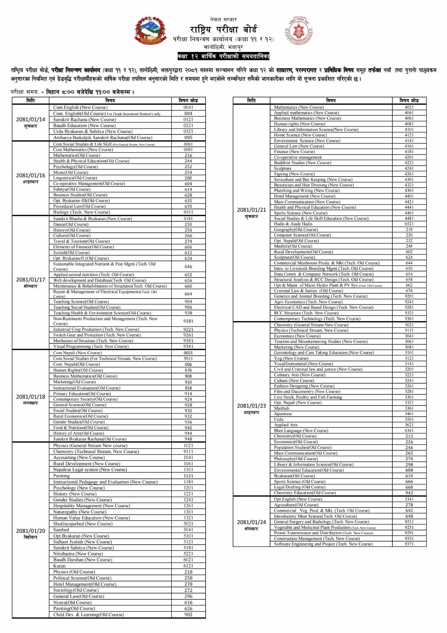 आगामी वैशाख १४ गतेदेखि बिहान ८ बजेदेखि ११ बजेसम्म सञ्चालन हुने परीक्षा वैशाख २६ गते सकिने परीक्षा नियन्त्रण कार्यालयले जनाएको छ ।