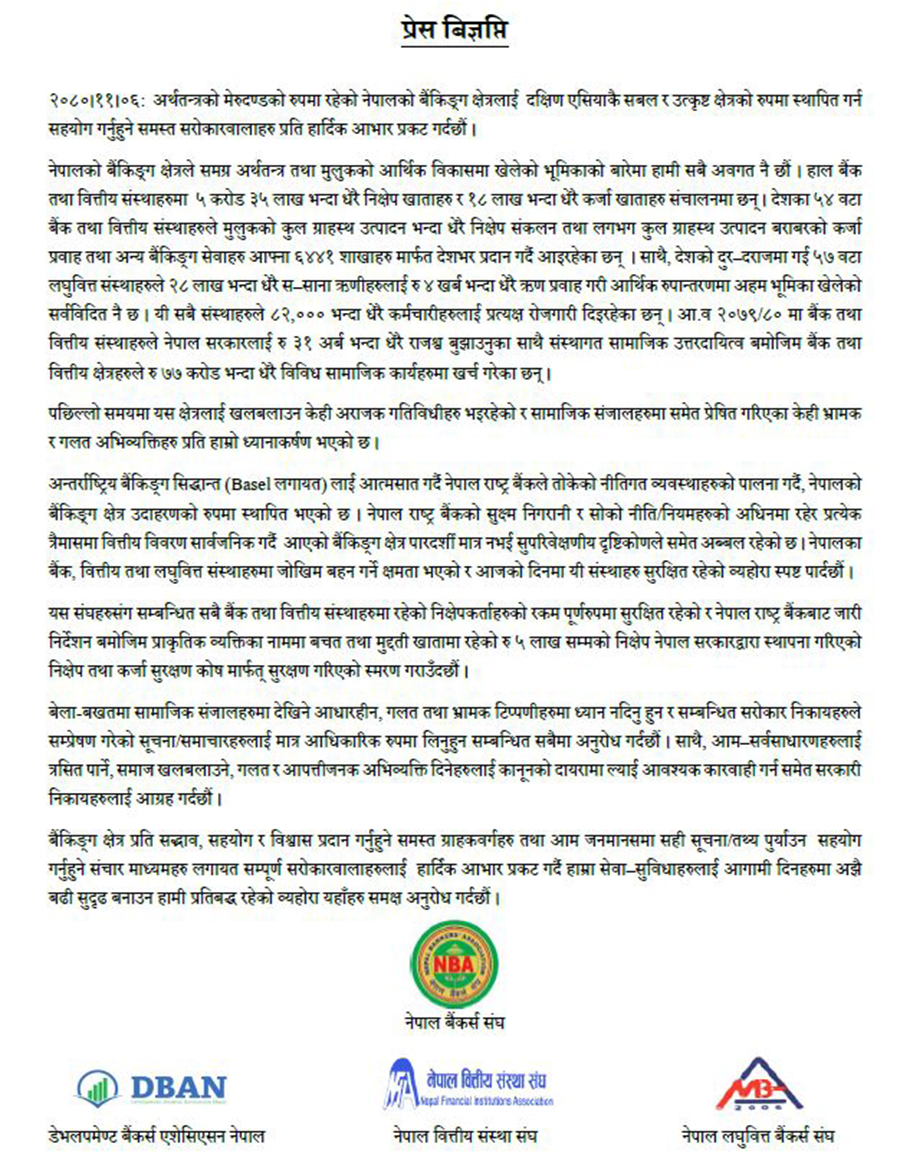 पछिल्लो समयमा बैंकिङ क्षेत्रमा धेरै नकारात्मक असर परेकोले भ्रमक सुचना प्रति आइतबार नेपाल बैकर्स संघ, डेभलपमेन्ट बैंकर्स एसोसिएसन नेपाल, नेपाल वित्तीय संस्था संघ र नेपाल लघुवित्त बैंकर्स संघले संयुक्त विज्ञप्ति जारी गर्दै बैंक तथा वित्तीय संस्था सुरक्षित रहेको बताएका हुन् । सबै बैंक तथा वित्तीय संस्थाहरुमा रहेको निक्षेपकर्ताहरुको रकम पूर्णरुपमा सुरक्षित रहेको विज्ञप्तिमा उल्लेख छ । उनीहरुले सर्वसाधारणलाई त्रसित पार्ने, समाज खलबलाउने, गलत र आपत्तिजनक अभिव्यक्ति दिनेलाई कानुनको दायरामा ल्याई आवश्यक कारवाही गर्न समेत सरकारसँग आग्रह गरेका छन् । ‘अन्तर्राष्ट्रिय बैंकिङ सिद्धान्तलाई आत्मसात गर्दै नेपाल राष्ट्र बैंकले तोकेको नीतिगत व्यवस्थाहरुको पालना गर्दै, नेपालको बैंकिङ क्षेत्र उदाहरणको रुपमा स्थापित भएको छ,’ विज्ञप्तिमा भनिएको छ, ‘नेपाल राष्ट्र बैंकको सुक्ष्म निगरानी र सोको नीति÷नियमहरुको अधिनमा रहेर प्रत्येक त्रैमासमा वित्तीय विवरण सार्वजनिक गर्दै आएको बैंकिङ क्षेत्र पारदर्शी मात्र नभई सुपरिवेक्षणीय दृष्टिकोणले समेत अब्बल रहेको छ ।’
