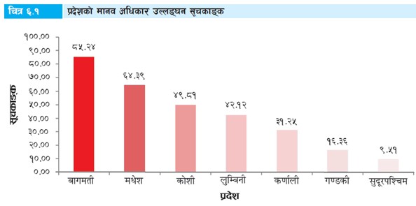 मधेशको ६४.३९, कोशीको ४९.८१, लुम्बिनीको ४२.१२, कर्णालीको ३१.२५, गण्डकीको १६.३६ र सुदूरपश्चिमको ९.५१ अङ्क रहेको सूचकाङ्कमा समावेश गरिएको छ। नेपाल मानव अधिकार वर्ष पुस्तक २०२४ मा प्रकाशित मानव अधिकार उल्लङ्घन सूचकाङ्क हेर्न यहाँ क्लिक गर्नु होला