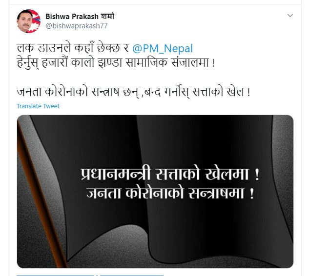 मंगलबार काँग्रेस प्रवक्ता विश्वप्रकाश शर्माले ’लकडाउनले कहाँ छेक्छ र हेर्नुस् हजारौँ कालो झण्डा सामाजिक सञ्जलामा !’ भन्दै प्रधानमन्त्रीको आधिकारिक ट्वीटर ह्यान्डलमा म्यान्सन गरेका छन् ।