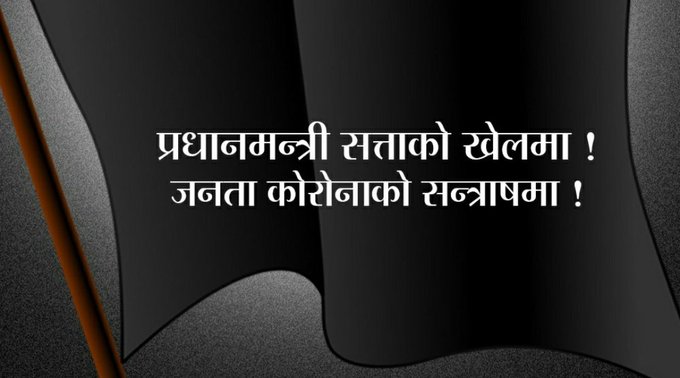 जनता कोरोनाको सन्त्रासमा रहेका बेला सत्ताको खेल बन्द गर्न उनको आग्रह छ । सामाजिक सञ्जालमा काँग्रेसले सार्वजनिक गरिएको कालो झण्डामा लेखिएको छ, ’प्रधानमन्त्री सत्ताको खेलमा, जनता कोरोनाको सन्त्रासमा !’