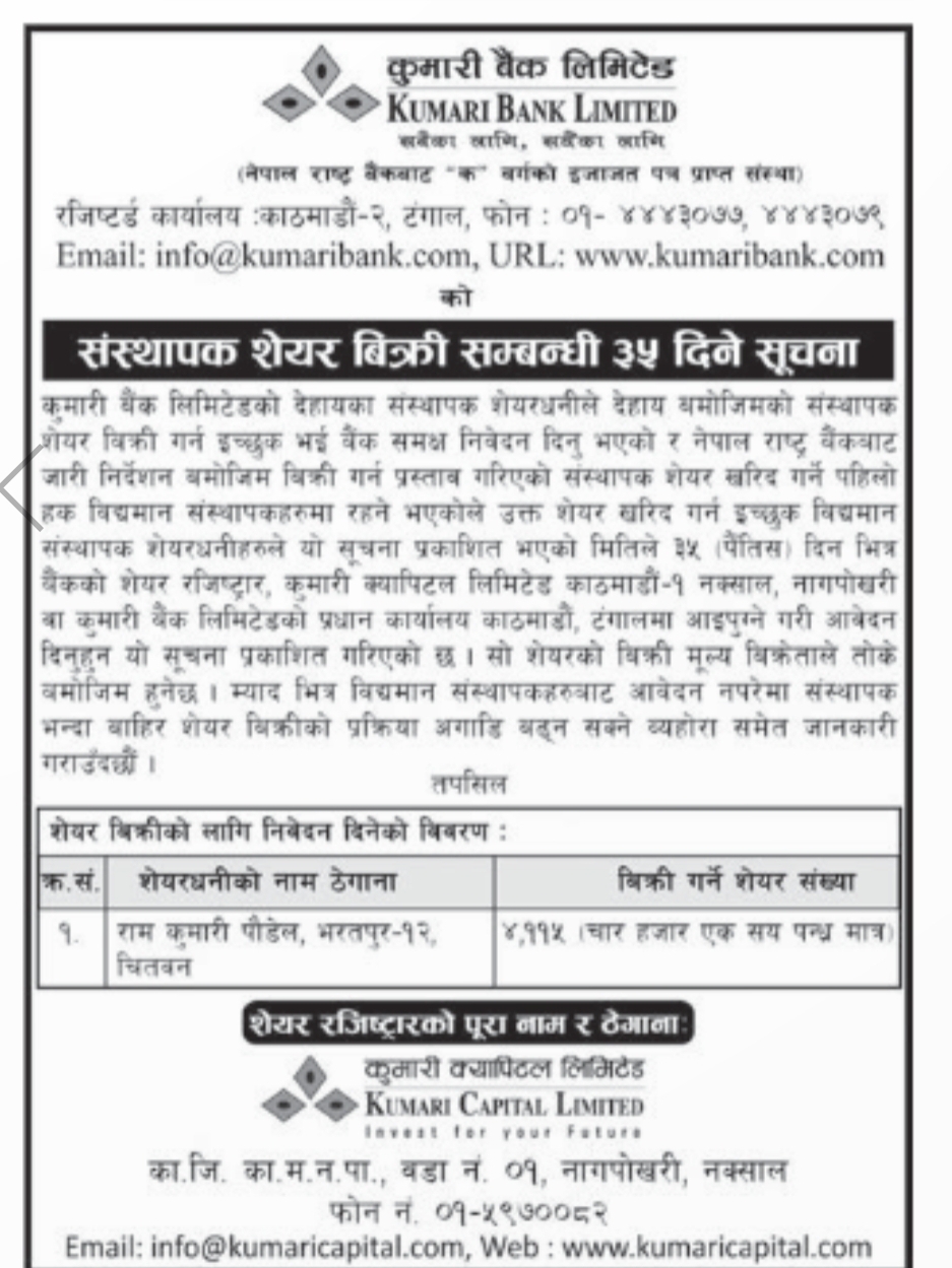 उक्त सेयरमा बैंकका विद्यमान अन्य संस्थापक सेयरधनीहरुले आवेदन दिन सक्नेछन् । सेयर खरिद गर्न इच्छुक संस्थापक सेयरधनीले आजबाट ३५ दिन भित्र बैंकको प्रधान कार्यालय, टंगाल वा कुमारी क्यापिटलको कार्यालय नक्साल नागपोखरी, काठमाडौंमा के कति सेयर खरिद गर्ने सोको व्यहोरा खुलाइ आवेदन दिनु पर्नेछ ।