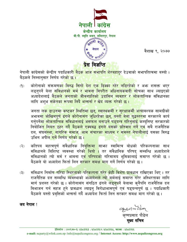 मंगलबार बसेको काँग्रेस पदाधिकारीको बैठकले अध्यादेशलाई जनताको जीवनप्रतिको उदासिन ब्यवहार र लोकतान्त्रिक संविधानका लागि अशुभ संकेतका रूपमा लिंदै भत्सर्ना र खेद व्यक्त गरेको प्रेस विज्ञप्ति मार्फत जानकारी दिएको छ । बैठकले अध्यादेश फिर्ता लिन पनि सरकारसँग माग गरेको छ ।
