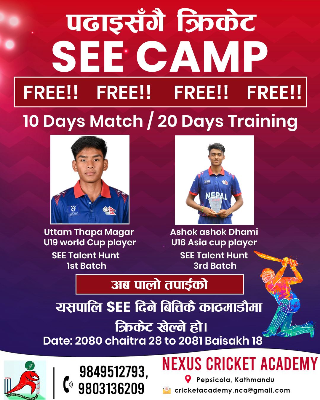 पुर्ण निशुल्क संचालन हुने SEE क्याम्प लाई सफलपार्न सहयोग का लागि सराेकार वाला सबैमा नेक्सस क्रिकेट एकेडेमीले अपिल समेत गरेकाे छ ।
