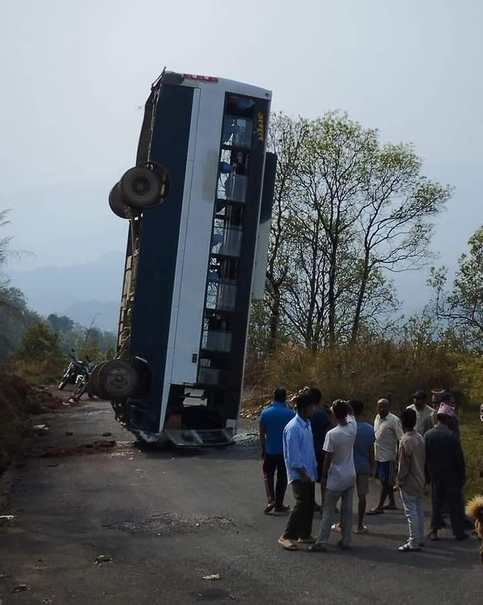 बस दुर्घटना भएर सडकमा ठाडै उभिएको तस्वीर र भिडियो सामाजिक सञ्जालमा भाइरल भएको छ ।