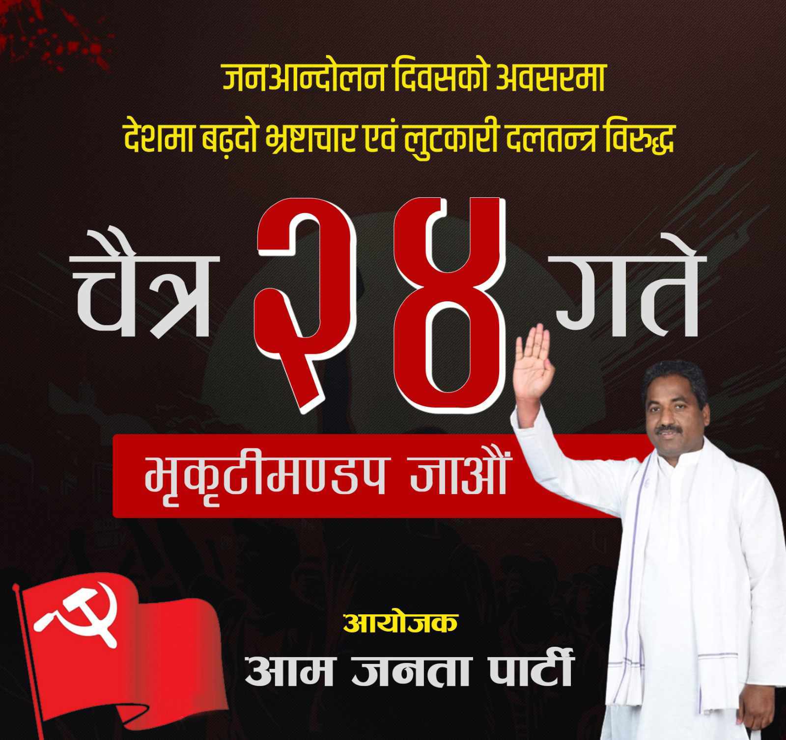 काठमाडौं – आम जनता पार्टी (आजपा) ले दलतन्त्र र भ्रष्टाचारको विरुद्धमा आज शनिबार काठमाडौंमा जनप्रदर्शन गर्दैछ ।