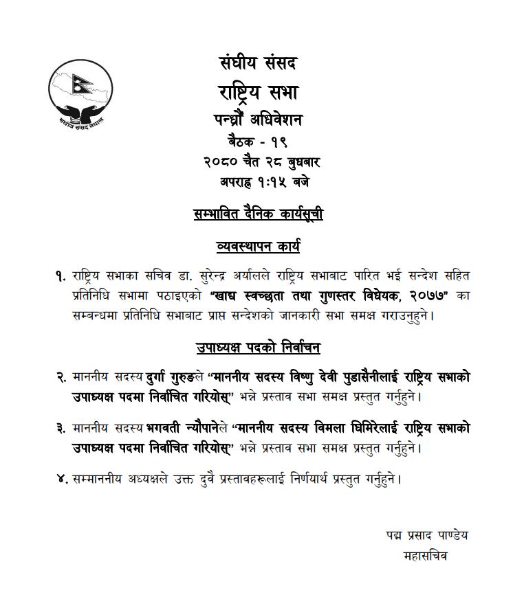 साथै, राष्ट्रियसभा अध्यक्ष नारायणप्रसाद दाहालले उपाध्यक्षका दुवै उम्मेदवारका प्रस्तावलाइ निर्णायार्थ प्रस्तुत गर्ने महासचिव पदमप्रसाद पाण्डेले सार्बजनिक गरेको सम्भावित कार्यसुचीमा उल्लेख गरिएको छ ।
