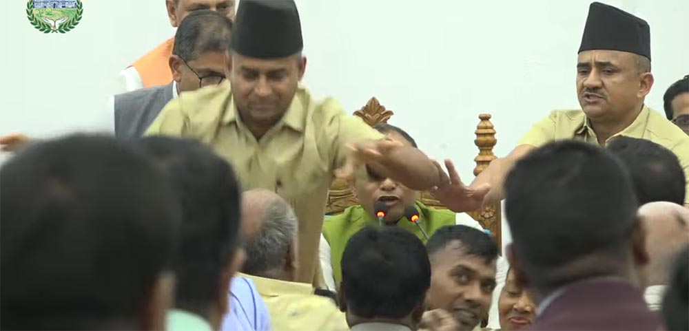 जनमत पार्टीका सांसदहरुले आफ्ना सांसदमाथि भएको आक्रमणको छानबिन समित गठन गर्नुपर्ने माग राख्दै अवरोध गरिरहेका छन् । त्यस क्रममा प्रदेशसभाको माइक समेत भाँच्चिएको छ । प्रदेशसभा सचिवालयका अनुसार माइक भाँचिएको र क्यामेरा फुटेको छ ।