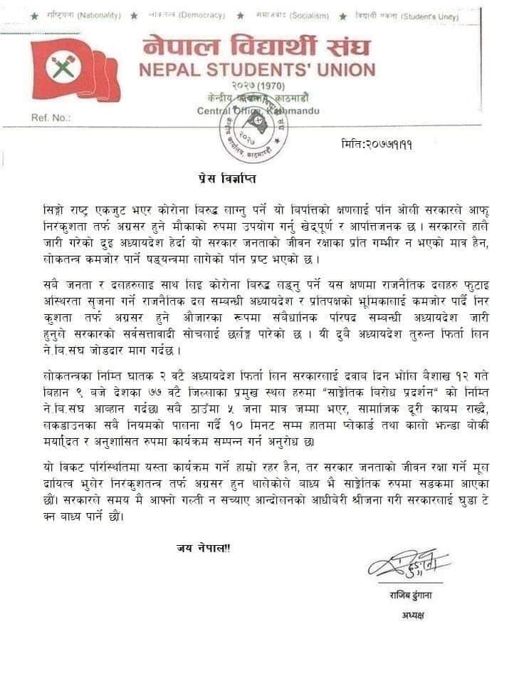 विहीबार नेविसंघका अध्यक्ष राजीव ढुंगानले एक विज्ञिप्त जारी गरि अध्यादेश फिर्ता लिन माग गर्दै देशभर विरोध प्रदर्शन गर्ने लागिएको जनाकारी दिए । अध्यादेशविरुद्ध भोलि विहान ९ बजे ७७ वटै जिल्लाका प्रमुख स्थानमा संकेतिक विरोध प्रदर्शनका लागि उनले आह्वन गरे ।