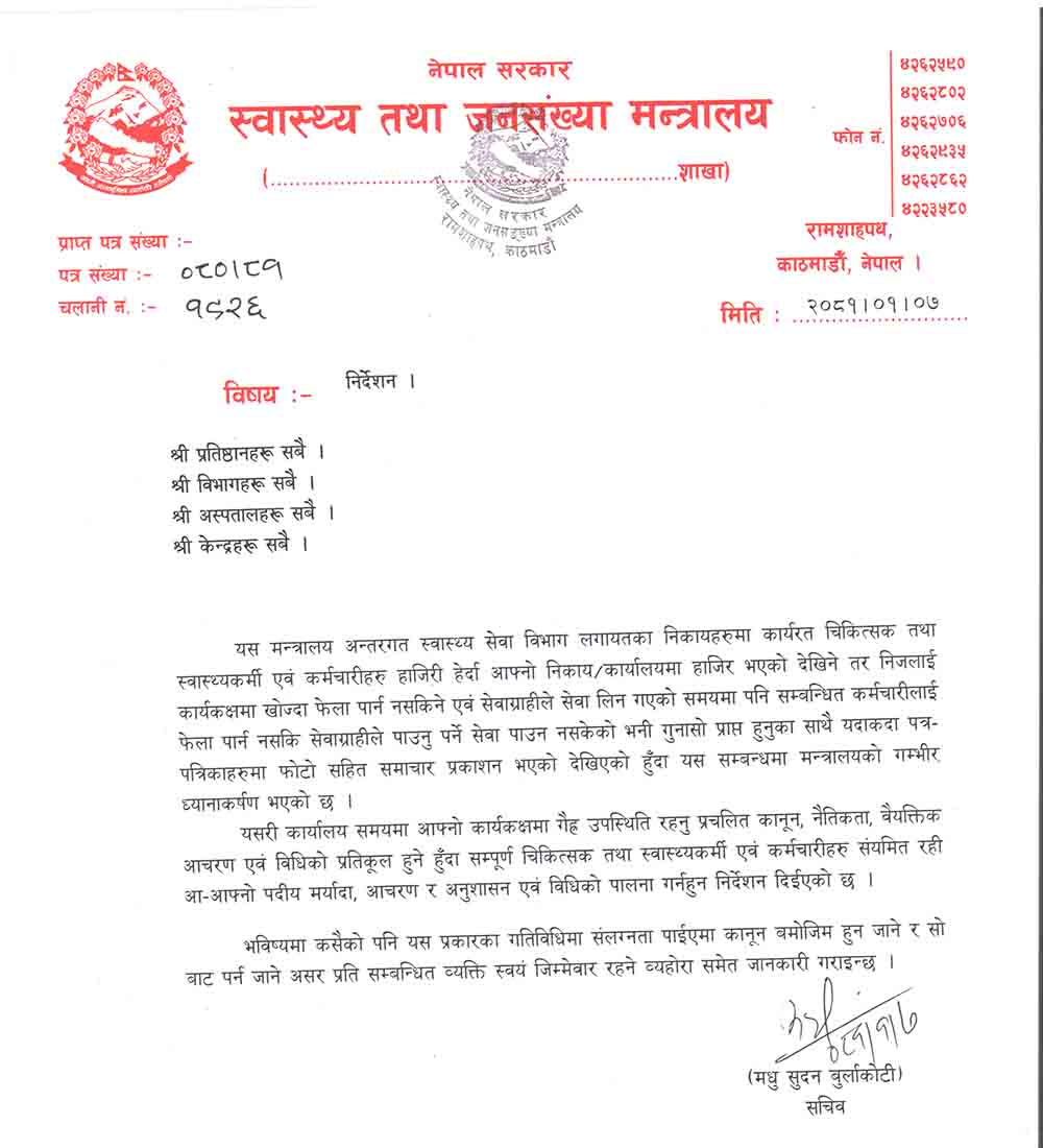 शुक्रबार निर्देशन जारी गर्दै मन्त्रालयले कार्यालय समयमा आफ्नो कार्यकक्षमा नहुने चिकित्सक तथा स्वास्थ्यकर्मीलाई कारबाही गर्ने चेतावनी दिएको हो । मन्त्रालयले सबै प्रतिष्ठान, विभाग, अस्पताल र केन्द्रहरूका चिकित्सक तथा स्वास्थ्यकर्मीलाई कार्यालय समयमा आफ्नो कार्यकक्षमा रहन निर्देशन दिदै कार्यरत चिकित्सक, स्वास्थ्यकर्मी तथा कर्मचारीहरू हाजिरी हेर्दा आफ्नो निकाय वा कार्यालयमा हाजिर भएको तर कार्यकक्षमा खोज्दा नभेटिएको, जसले गर्दा सेवाग्राहीले सेवा नपाएको निर्देशनमा उल्लेख छ ।