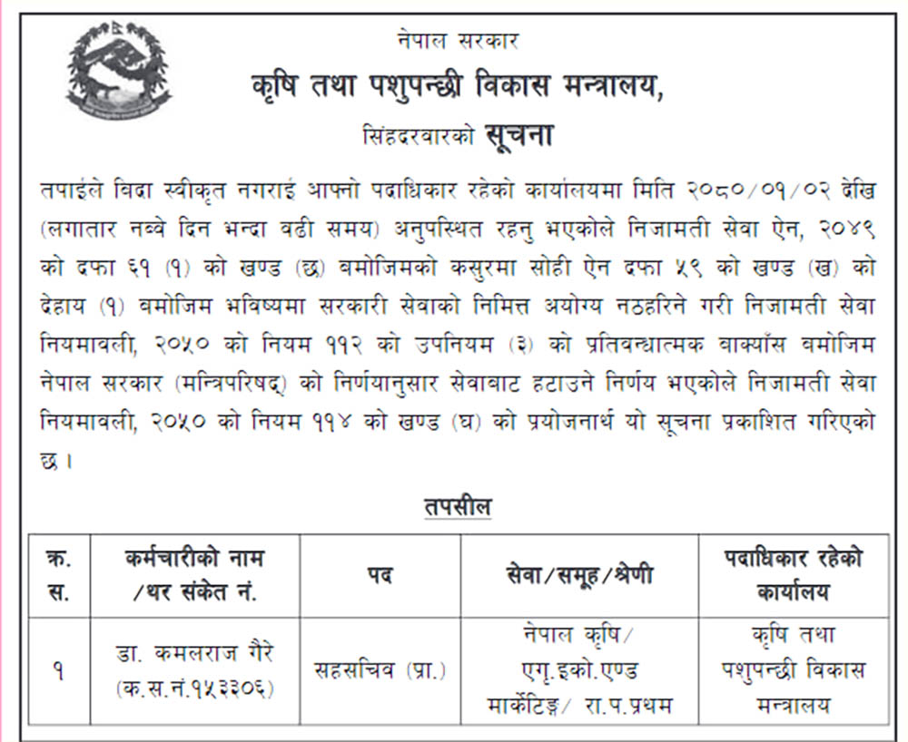 शुक्रबार मन्त्रालयले सूचना प्रकाशन गरी २०८० वैशाख २ गतेदेखि सम्पर्कमा नरहेको भन्दै सेवाबाट बर्खास्त गरिएको जानकारी दिएको हो ।