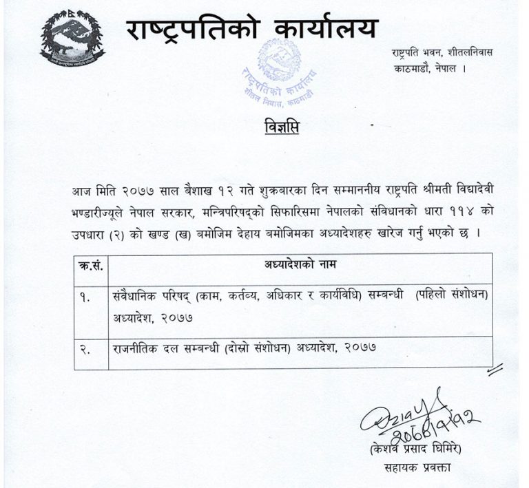मन्त्रिपरिषदले सिफारिस गरेपछि अध्यादेश खारेज गरिएको राष्ट्रपति कार्यालयका सहायक प्रवक्ता केशवप्रसाद घिमिरेद्वारा जारी विज्ञप्तिमा उल्लेख छ ।