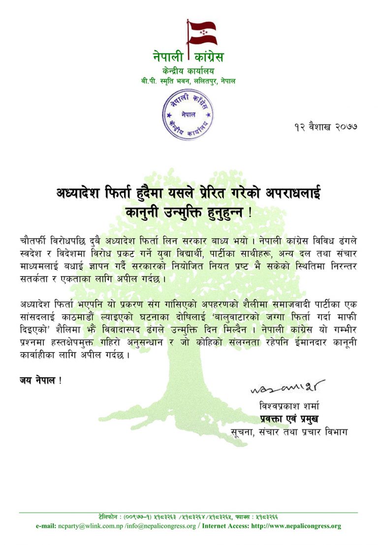 कांग्रेसका प्रवक्ता विश्वप्रकाश शर्माले शुक्रबार एक प्रेस विज्ञप्ति जारी गर्दै भनेका छन्, ‘अध्यादेश फिर्ता भए पनि यो प्रकरणसँग गाँसिएको अपहरण शैलीमा समाजवादी पार्टीका एक सांसदलाई काठमाडौं ल्याइएको घटनाका दोषीलाई ‘बालुवाटारको जग्गा फिर्ता गर्दा माफी दिइएको’ शैलीमा झैं विवादास्पद ढंगले उन्मुक्ति दिन मिल्दैन ।’