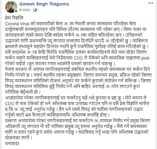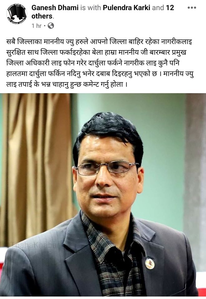 शुक्रबार नै गणेश धामी नाम गरेको फेसबुक आइडीबाट सांसद ठगुन्नाको फोटो राखेर अरु जिल्लाका माननीय ज्यु हरु आफ्ना नागरिलाई सुरक्षित जिल्ला पठाइरहेका छन् तर हाम्रा माननीय प्रमुख जिल्ला अधिकारीलाई बारम्बार फोन गरेर जिल्ला फर्किने नागरिकलाई कुनै हालतमा पनि फर्किन नदिनु भनेर दबाब दिइरहेका छन् भनेर लेखेका छन् ।