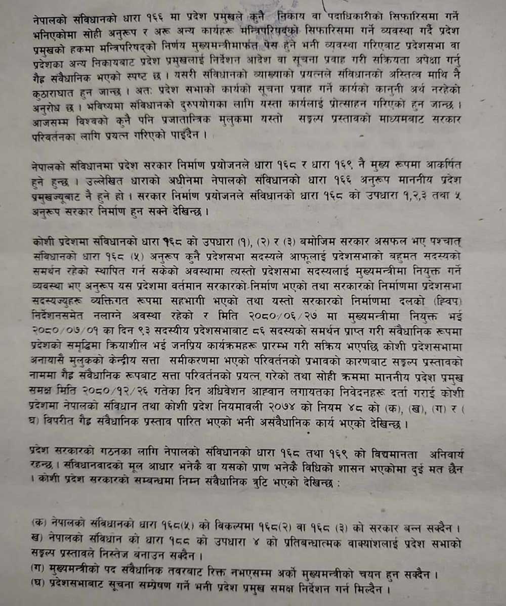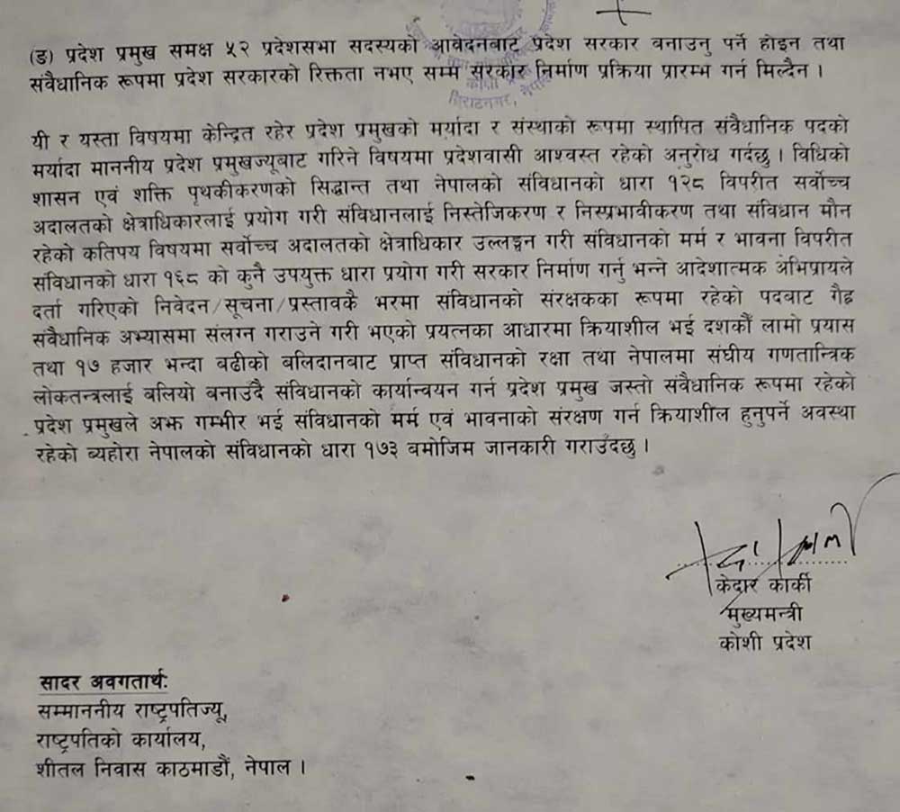 विराटनगर – कोशी प्रदेशका मुख्यमन्त्री केदार कार्कीले गैरसंवैधानिक अभ्यास नगर्न आग्रह गर्दै प्रदेश प्रमुखलाई पत्र लेखेका छन् ।