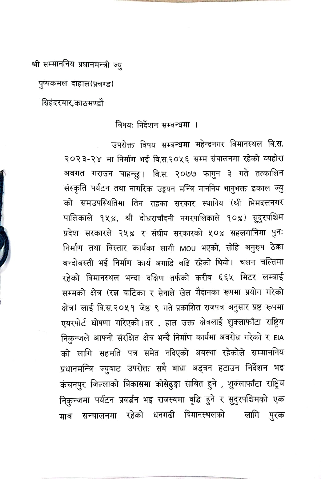 चलन चल्तीमा रहेको विमानस्थल भन्दा दक्षिण तर्फको करिब ६६५ मिटर लम्बाई क्षेत्रलाई २०५१ जेष्ठ ९ गते प्रकाशित राजपत्र अनुसार प्रष्ट रुपमा एयरपोर्ट घोषणा गरिएको र हाल पनि उत्तः क्षेत्रलाई शुक्लाफाँटा राष्ट्रिय निकुञ्जले आफ्नो संरक्षित क्षेत्र भन्दै निर्माण कार्यमा अवरोध गरेकोमा प्रधानमन्त्रीबाट बाधा अड्कन फुकाउ गर्न निर्देशन भए कञ्चनपुरको विकासमा कोशेढुंगा सावित हुनुका साथै पर्यटन बृद्धि, राजश्व बृद्धि हुनेभएकाले विमानस्थल अगाडी बढाउन प्रधानमन्त्रीबाट निर्देशक हुनेमा आशावादी रहेको समेत पत्रमा उल्लेख गरिएको छ ।