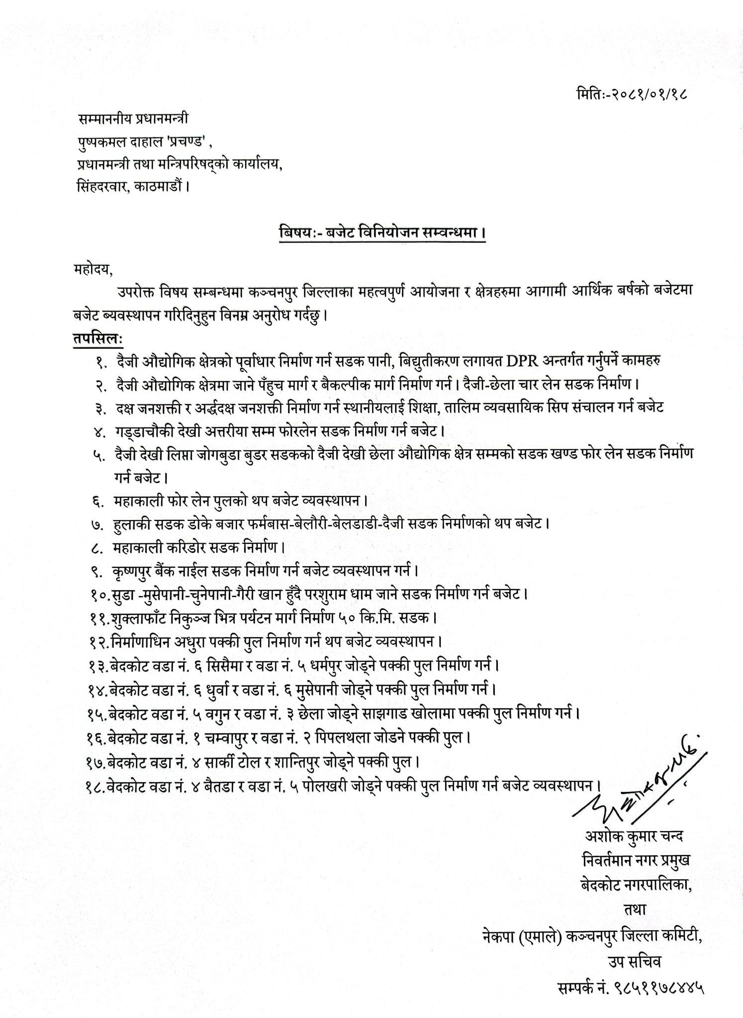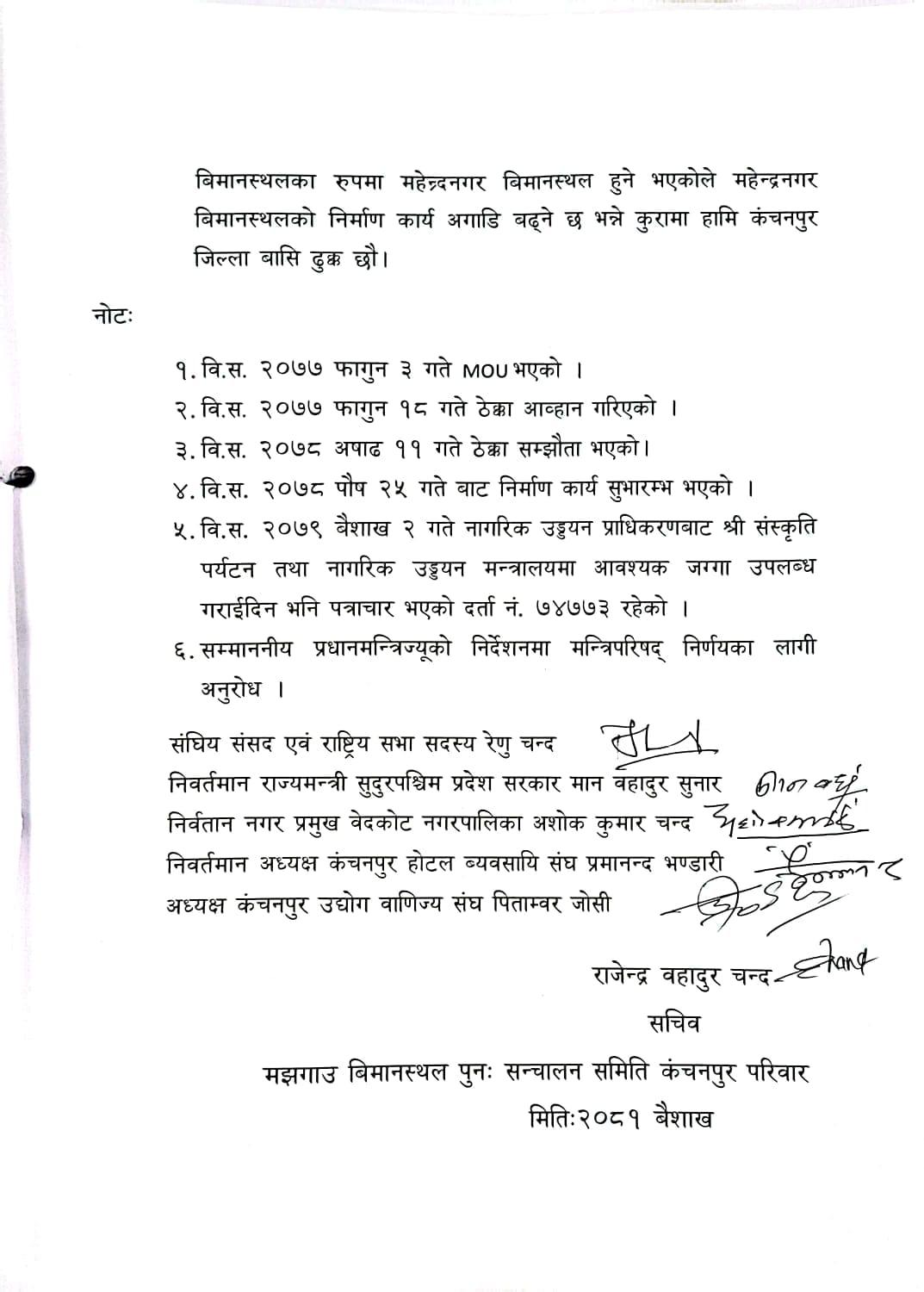 संघीय संसद तथा राष्ट्रिय सभा सदस्य रेणु चन्द, सुदूरपश्चिम प्रदेशका पूर्व राज्यमन्त्री मान बहादुर सुनार, बेदकोट नगरपालिकाका पूर्व मेयर अशोक कुमार चन्द, कञ्चनपुर होटल व्यवसायी संघका पूर्व अध्यष प्रमानन्द भण्डारी, कञ्चनपुर उद्योग वाणिज्य संघका अध्यक्ष पिताम्बर जोशीसँगँ राजेन्द्र बहादुर चन्दले संयुक्त हस्ताक्षर गरि उक्त पत्र पेश गरेका छन् ।