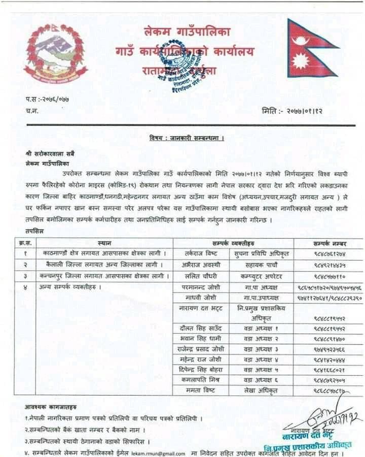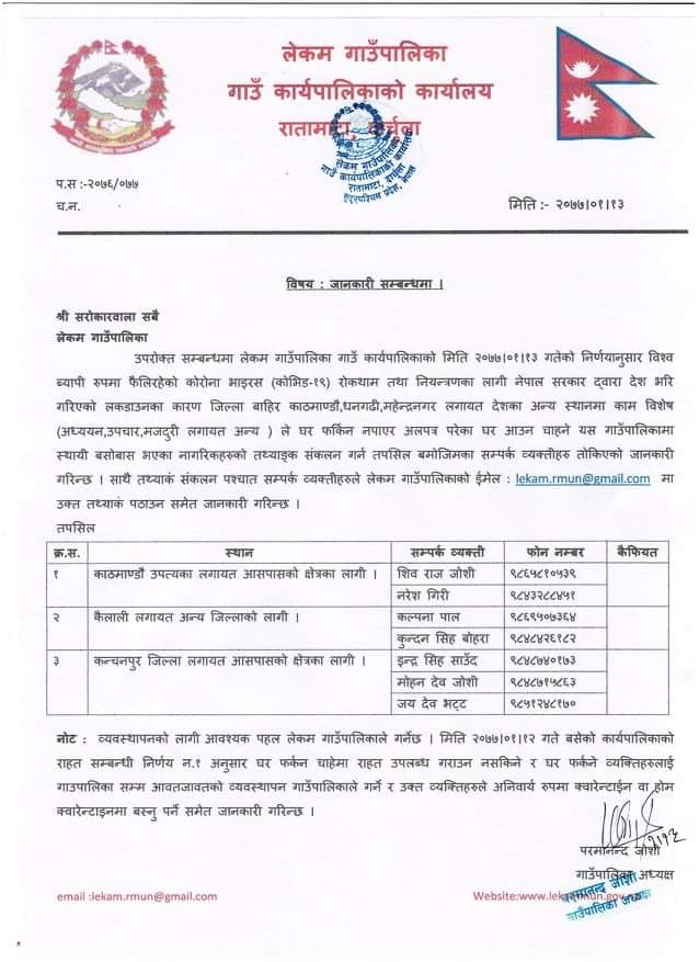 लेकम गाउँकार्यपालिकाको बैशाख १३ गतेको निर्णय अनुसार लक डाउनका कारण देशका विभिन्न ठाउँमा अलपत्र परेका विद्यार्थी, मदजुदर, उपचार गराउन गएका तथा अन्य कामले घर फर्किन नसकेका नगरिकहरुलाई गाउँपालिकाले उद्धार गर्ने निर्णय गरेको हो । गाउँपालिकाले काठमाडौँ लगायत आसपास क्षेत्रको लागि शिवराज जोशी, र नरे गिरीलाई सम्पर्क गर्न भनेको छ, त्यसै कैलाली र अन्य जिल्लाका लागि कल्पना पाल र कुन्दनसिंह बोहरा तथा कञ्चनपुर जिल्लाका लागि इन्द्र साउँद, मोहन देव जोशी र जयदेव भट्टलाई आधिकारिक व्यक्ति तोकेको छ ।