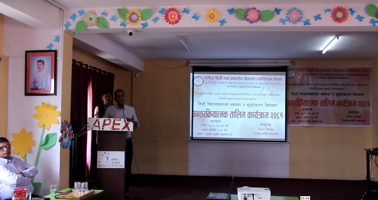 काठमाडौँ – राष्ट्रिय निजी तथा आवासीय विद्यालय एसोसिएसन नेपाल (एनप्याब्सन) काठमाडौँ जिल्ला समितिको आयोजना प्रिन्सिपलहरुलाई तालिम दिएको छ । दुई सत्रमा सम्पन्न गर्ने गरी एक दिने तालिमको आयोजना गरिएको नेशनल प्याब्सन काठमाडौँ जिल्ला समितिका अध्यक्ष अमृत कुमार खड्काले जानकारी दिनुभयो ।