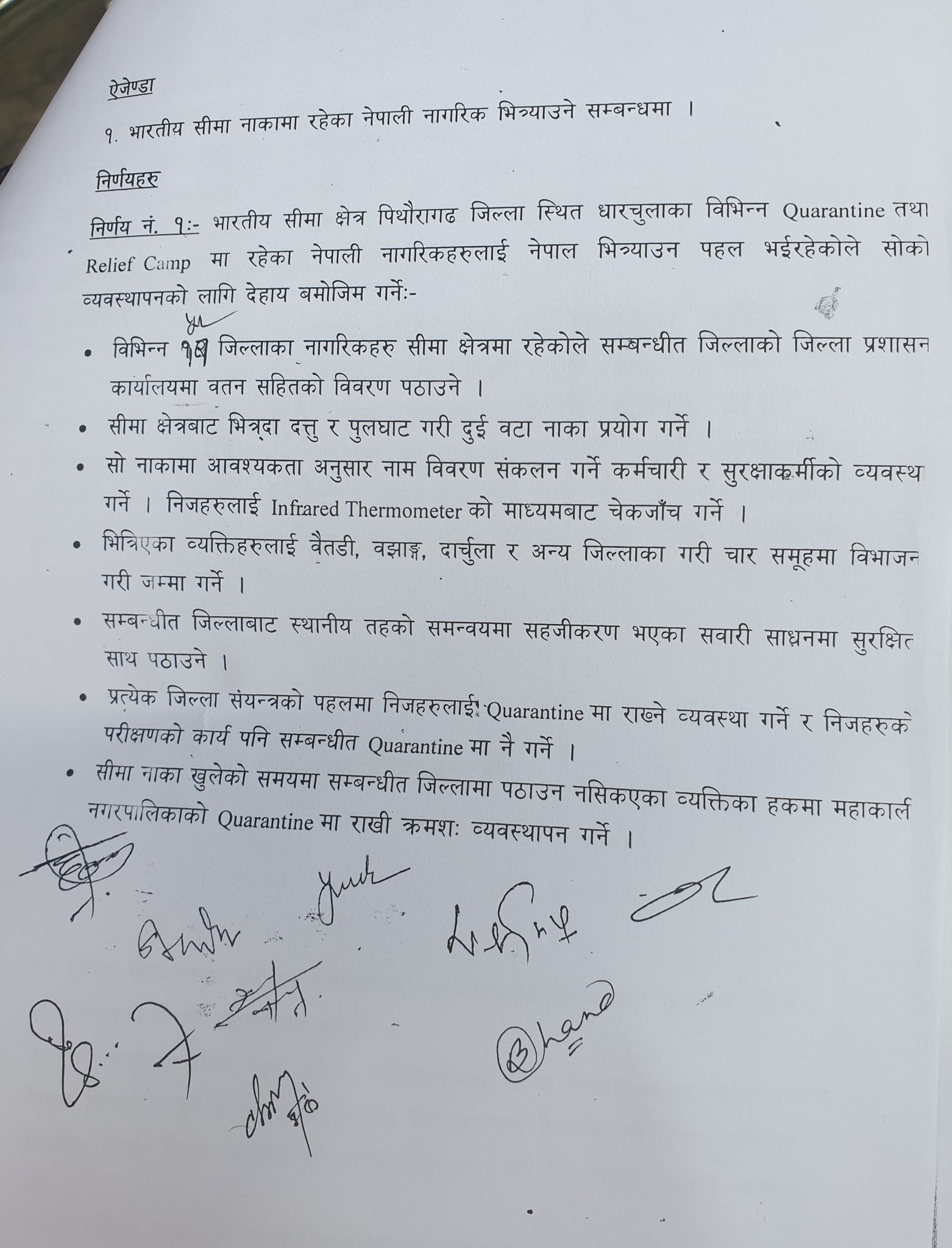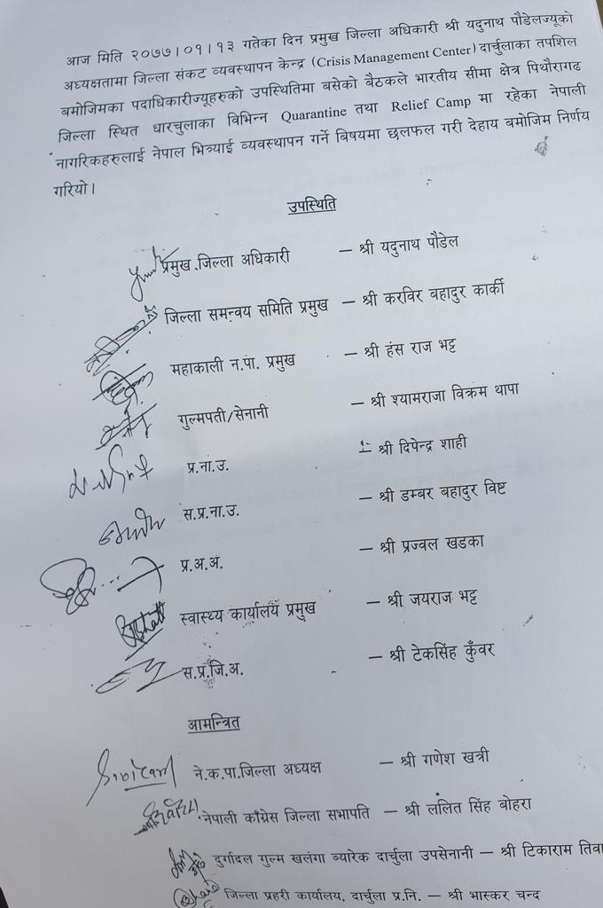 प्रमुख जिल्ला अधिकारी यदुनाथ पौडेलको अध्यक्षतामा शनिबार बसेको केन्द्रको बैठकले पिथौरागढ जिल्लाको धारचुलाका विभिन्न क्वारेन्टाइनमा बसेका नेपालीहरुलाई आवश्यक प्रबन्ध मिलाई नेपाल भित्र्याउने निर्णय गरेको हो ।