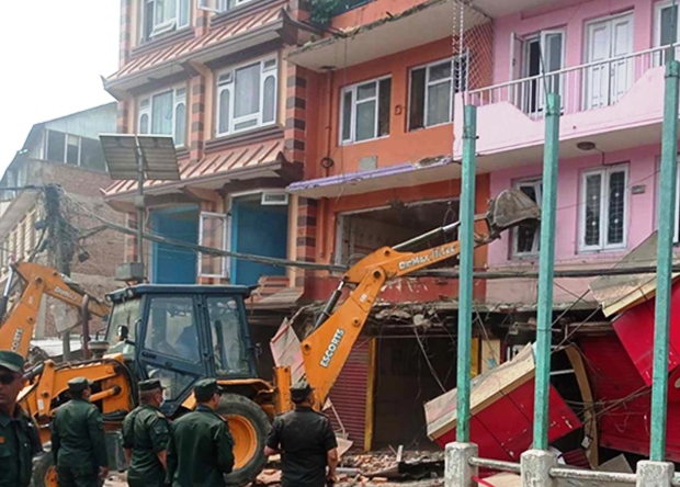 काठमाडौं – गौशाला चोक८ मा सडक क्षेत्र अतिक्रमण गरी बनाइएका घरहरुमा काठमाडौं महानगरपालिकाले डोजर चलाएको छ । सडक किनारमा अतिक्रमण गरी बनाइएका घर तथा पसलहरुमा महानगरपालिकाले आज बिहान डोजर चलाएको हो ।
