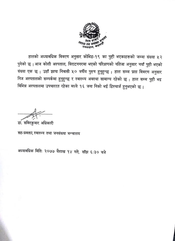 यो सँगै कोरोना संक्रमितको संख्या ५२ पुगेको छ ।