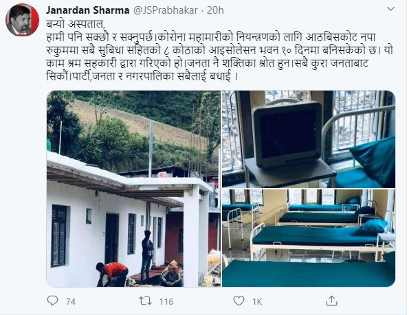 अस्पताल निर्माणको काम सम्पन्न भएलगत्तै नेता नेकपा नेता जनार्दन शर्माले अभियानमा खट्ने जनता, पार्टी कार्यकर्ता र नगरपालिकालाई बधाई दिएका छन् । शर्मा रुकुमबाट प्रतिनिधि सभा सदस्यमा निर्वाचित भएका थिए । उनले भनेका छन्– ‘हामी पनि सक्नुपर्छ र सक्छौं । जनता नै शक्तिका श्रोत हुन्, सबै कुरा जनताबाट सिंकौ ।’