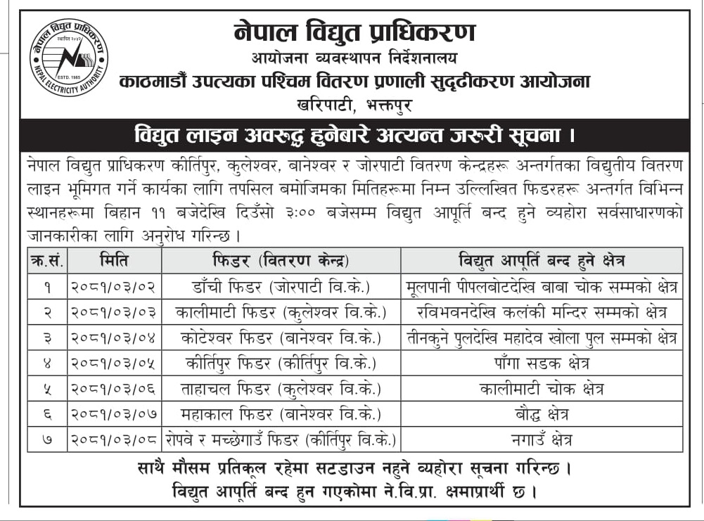आयोजनाले विद्युतीय लाइन भूमिगत गर्ने कार्यका लागि विभिन्न स्थानमा बिहान ११ बजेदेखि दिउँसो ३ बजेसम्म विद्युत आपूर्ति बन्द हुने जनाएको छ। आइतबार जोरपाटी वितरण केन्द्रको डाँची फिडर अन्तर्गत मूलपानी पीपलबोटदेखि बाबा चोकसम्मको क्षेत्रमा विद्युत् अवरूद्ध हुनेछ।