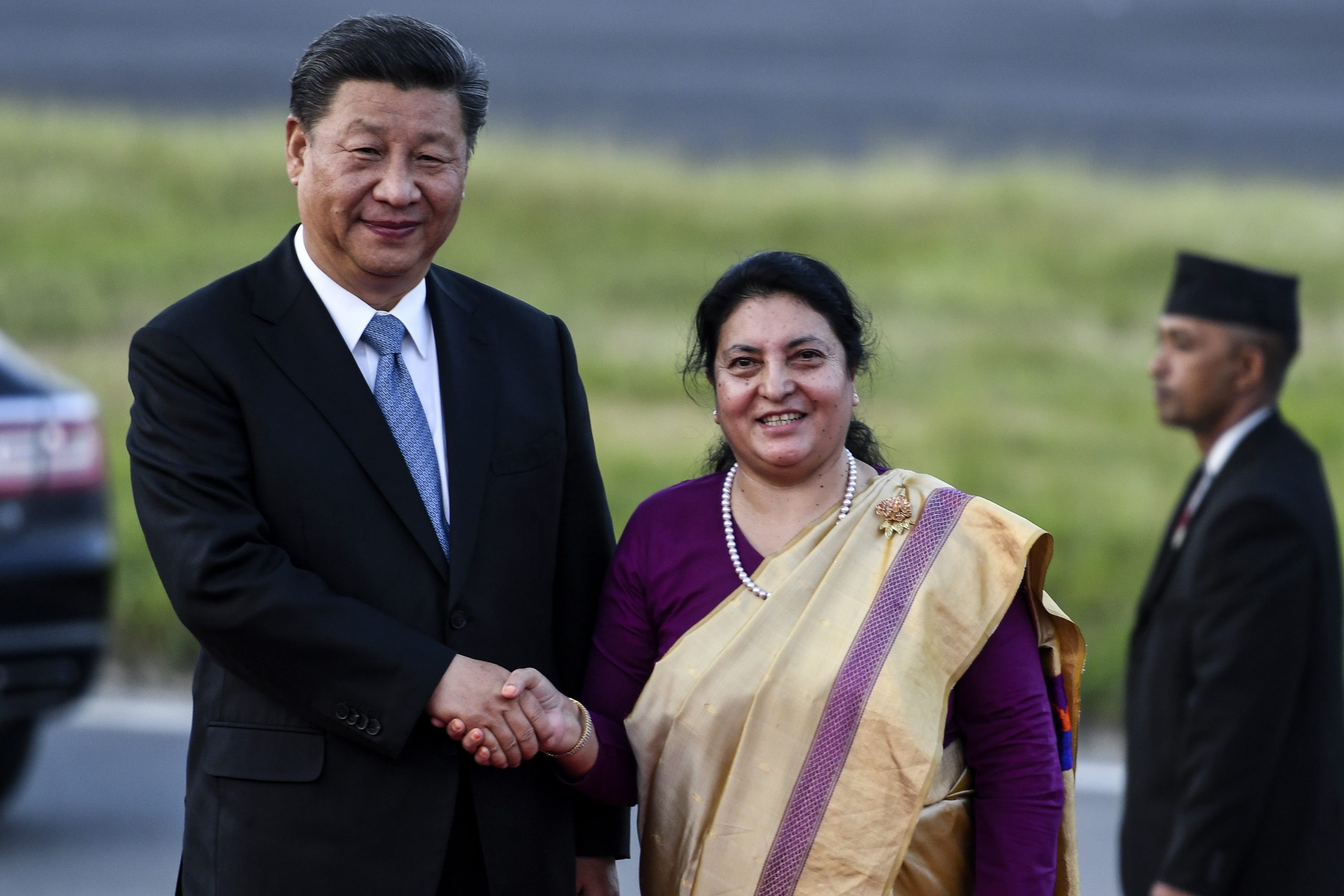 Chinese President Xi Jinping is welcomed by Nepalese President Bidhya Devi Bhandari upon arrival at Tribhuvan International Airport in Kathmandu, Nepal, Saturday, Oct. 12, 2019. Xi on Saturday became the first Chinese president in more than two decades to visit Nepal, where he's expected to sign agreements on some infrastructure projects.(Prakash Mathema/Pool Photo via AP)