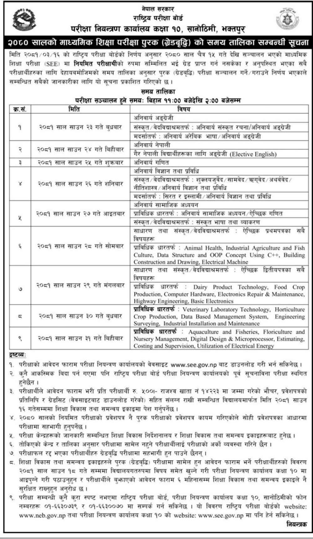 कार्यालयले आज सूचना जारी गर्दै २०८० चैत्र १५ गतेदेखि सञ्चालन भएको एसइईमा नियमित परीक्षार्थीको रुपमा सम्मिलित भई ग्रेड प्राप्त गर्न नसकेका र अनुपस्थित भएका सबै परीक्षार्थीहरूका लागि समय तालिका सार्वजनिक गरेको हो।
