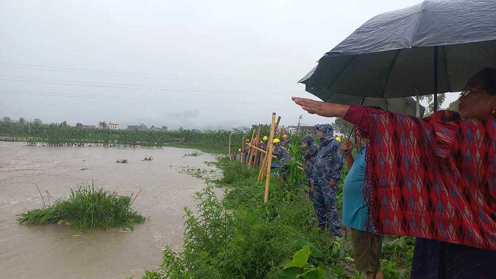 नदीको बहाव बढेर बस्तीमा पानी पसेपछि भक्तपुरबाट खटिएको सुरक्षा फौजले बस्ती ईलाका कटान नियन्त्रणका लागि बास र जस्तापाताले अस्थायी बार बनाएको छ । प्रहरीले लगातारको बर्षापछि नदी आसपासका क्षेत्रमा सतर्कता अपनाउन स्थानीयलाई आग्रह गरेको छ ।