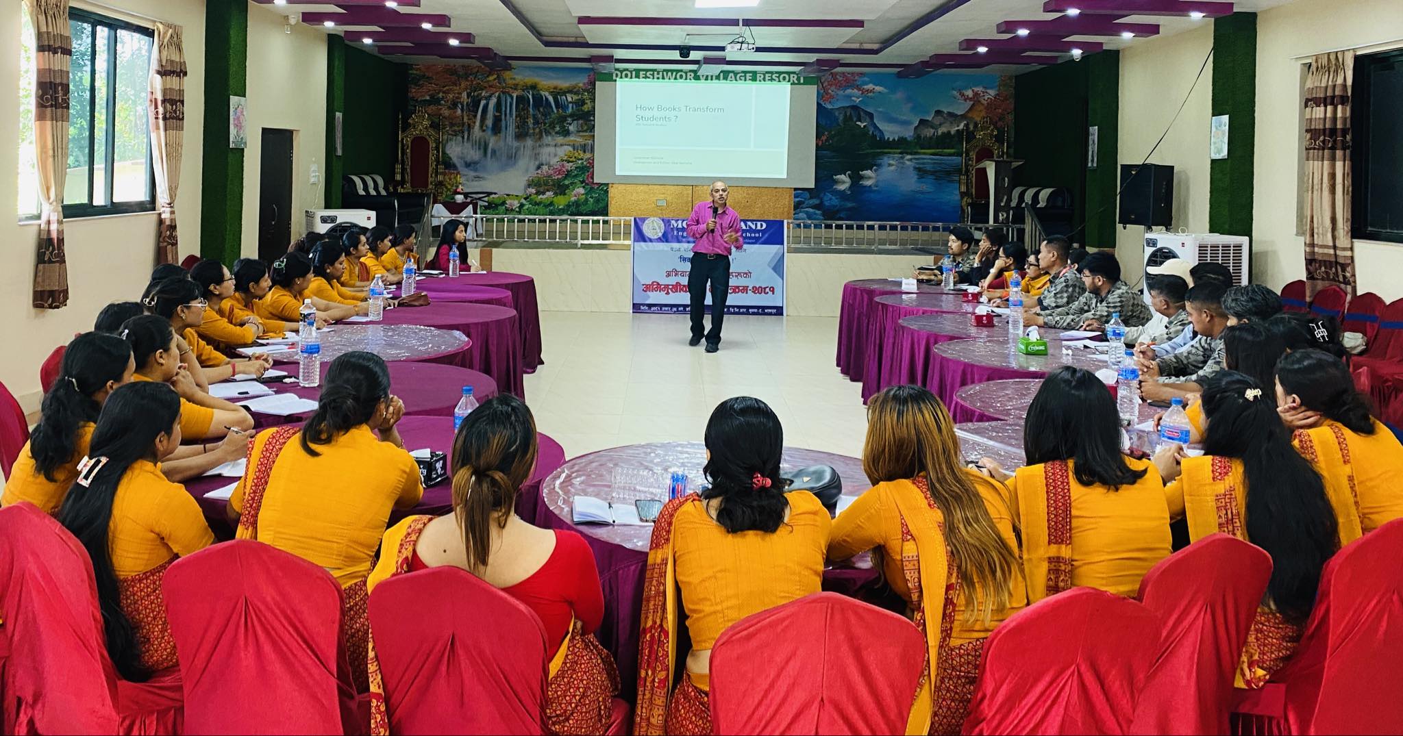मदरल्याण्ड स्कुलमा कार्यरत ४२ जना शिक्षकहरुलाई आज प्रशिक्षकद्वय हरिहर तिमिल्सिना र सुदर्शन घिमिरेले दुई चरणमा प्रशिक्षण दिनु भएको थियो ! प्रशिक्षक हरिहर तिमिल्सिनाले एक शिक्षकले कम्तीमा महिनाको एउटा किताब पढ्नै पर्ने सन्दर्भ जोड्दै किताबले नै शिक्षकको सक्षमता बढाउँछ जसले गर्दा विद्यार्थीहरुमा पनि पढ्ने हौसला प्रदान हुने उल्लेख गर्नु भएको थियो । अर्का प्रशिक्षक सुदर्शन घिमिरेले किताब यस्तो औषधि हो जसको निरन्तर अध्ययनले मानिसलाई नयाँ जीवन प्रदान गर्छ र व्यवहारिक जीवनमा आइपर्ने तनावलाई समेत हटाउन मद्दत गर्छ साथै प्रत्येक शिक्षकले हरेक दिन समय तालिका बनाई किताब पढ्ने बानी बसाल्नु पर्ने कुरामा जोड दिनु भएको थियो ।