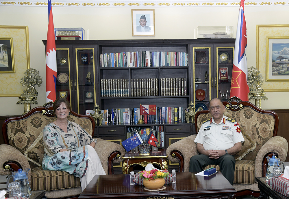 काठमाडौँ । प्रधानसेनापति प्रभुराम शर्मा र नेपालका लागि अष्ट्रेलियाका महामहिम राजदूत फेलिसिटी भोल्कबीच जङ्गी अड्डामा शिष्टाचार भेट भएको छ ।