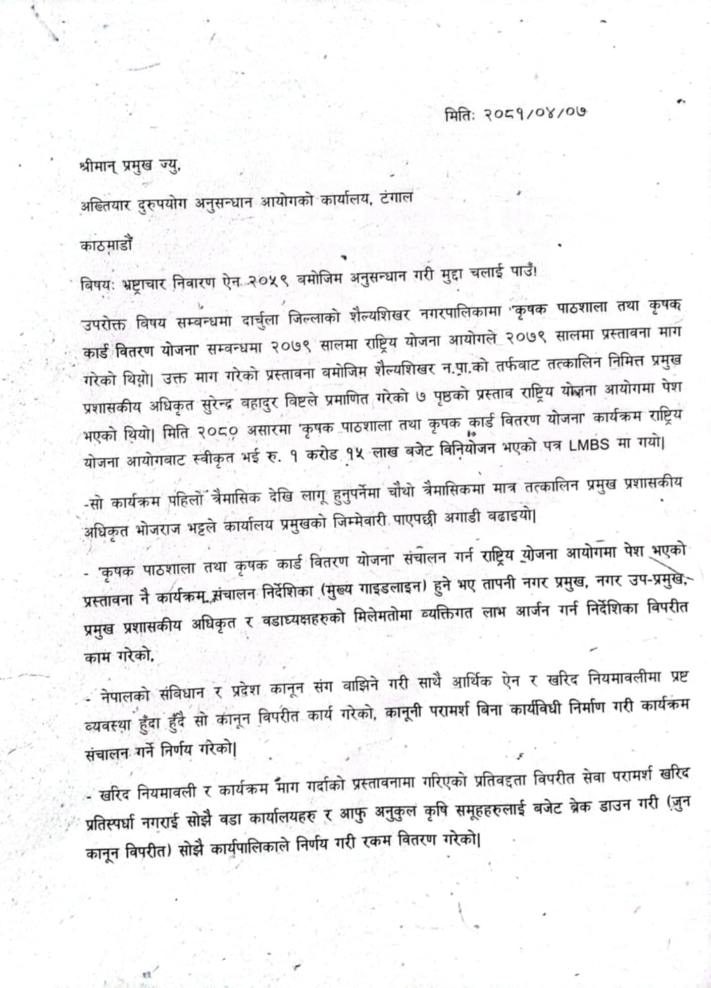 अधिवक्ता जोशीले नगरपालिकाले ‘कृषक पाठशाला तथा कृषक वार्ड वितरण योजना’मा मेयर/उपमेयर, वडाध्यक्ष, तत्कालिन हाकीमहरूले १ करोड १५ लाख भ्रष्ट्राचार गरेको र सो रकम बिगो कायम गरेर उनीहरूलाई पक्राउ गर्दै मुद्दा चलाउन अख्तियारसँग माग गरेका छन्।