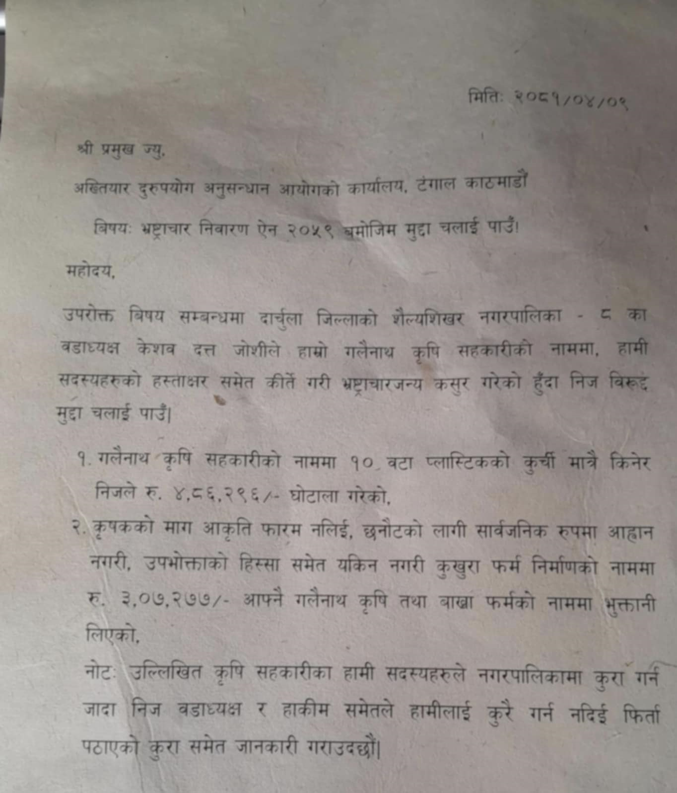 अख्तियार दुरुपयोग अनुसन्धान आयोगको कार्यालय टंगाल काठमाडौँमा वडा अध्यक्ष जोशी विरुद्ध भ्रष्टाचार निवारण ऐन २०५९ बमोजिम मुद्दा चलाइपाउँ भन्दै निवेदन परेको हो । निवेदन अनुसार वडा अध्यक्ष जोशीले गलैनाथ कृषि सहकारीको नाममा सहकारी सदस्यहरको हस्ताक्षर किर्ते गरी भ्रष्टाचार गरेको हो ।