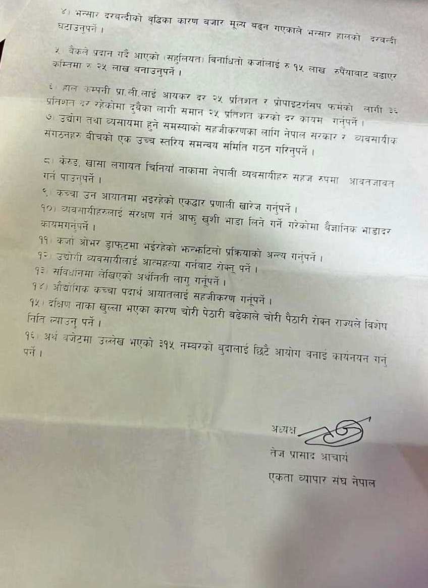 यस्तै एकता व्यापार संघले दक्ष जनशक्ति उत्पादन गर्ने प्रत्येक स्थानीय तहमा तालिम केन्द्रका स्थापना गर्नुपर्ने माग अघि सारेको छ । स्वदेशी उत्पादनलार्ई प्रोत्साहन गर्ने, कच्चा पदार्थ कच्चा पदार्थ आयातामा सहुलियत दिनुपर्ने, बैंक तथा वित्तीय संस्थाको उच्च व्याजदरका कारण व्यवसायहरुनै पलायन हुनुपर्ने अवस्थालाई मध्यनजर गर्दै कर्जा व्याजदर एकल अंकमा कायम गर्नुपर्ने लगायतका माग संघले राखेको छ ।