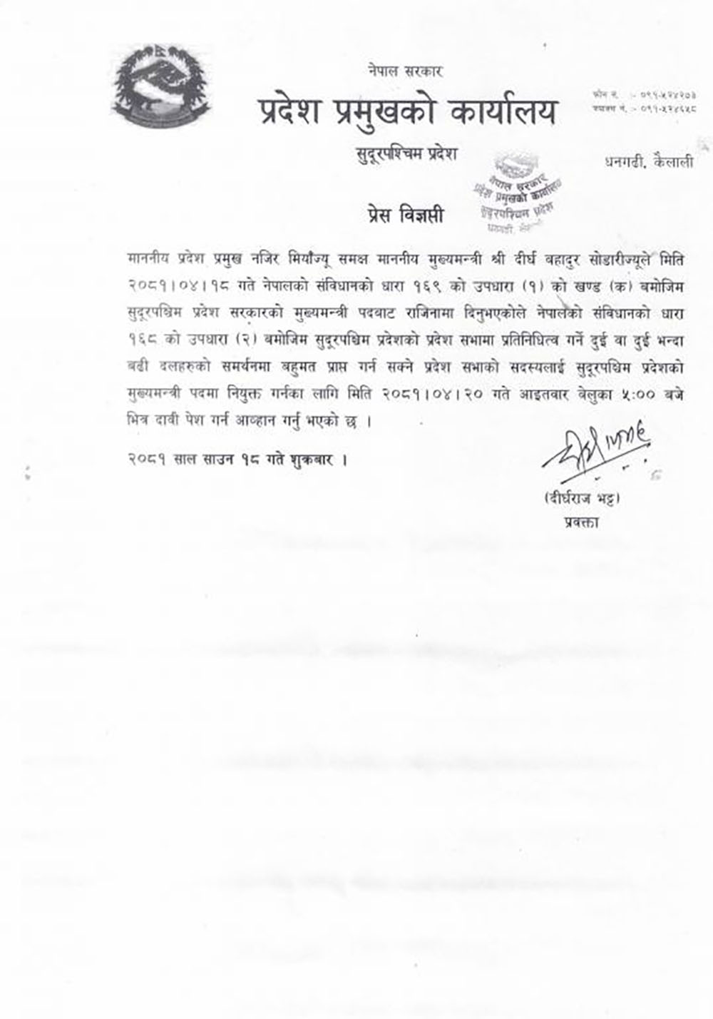 शुक्रबार मुख्यमन्त्री दीर्घबहादुर सोडारीले राजीनामा दिएपछि प्रदेश प्रमुख मियाँले आइतबार बेलुका ५ बजेसम्म संबिधानको धारा १६८ को उपधारा २ बमोजिम सरकार गठनको आव्हान गरेका हुन् ।