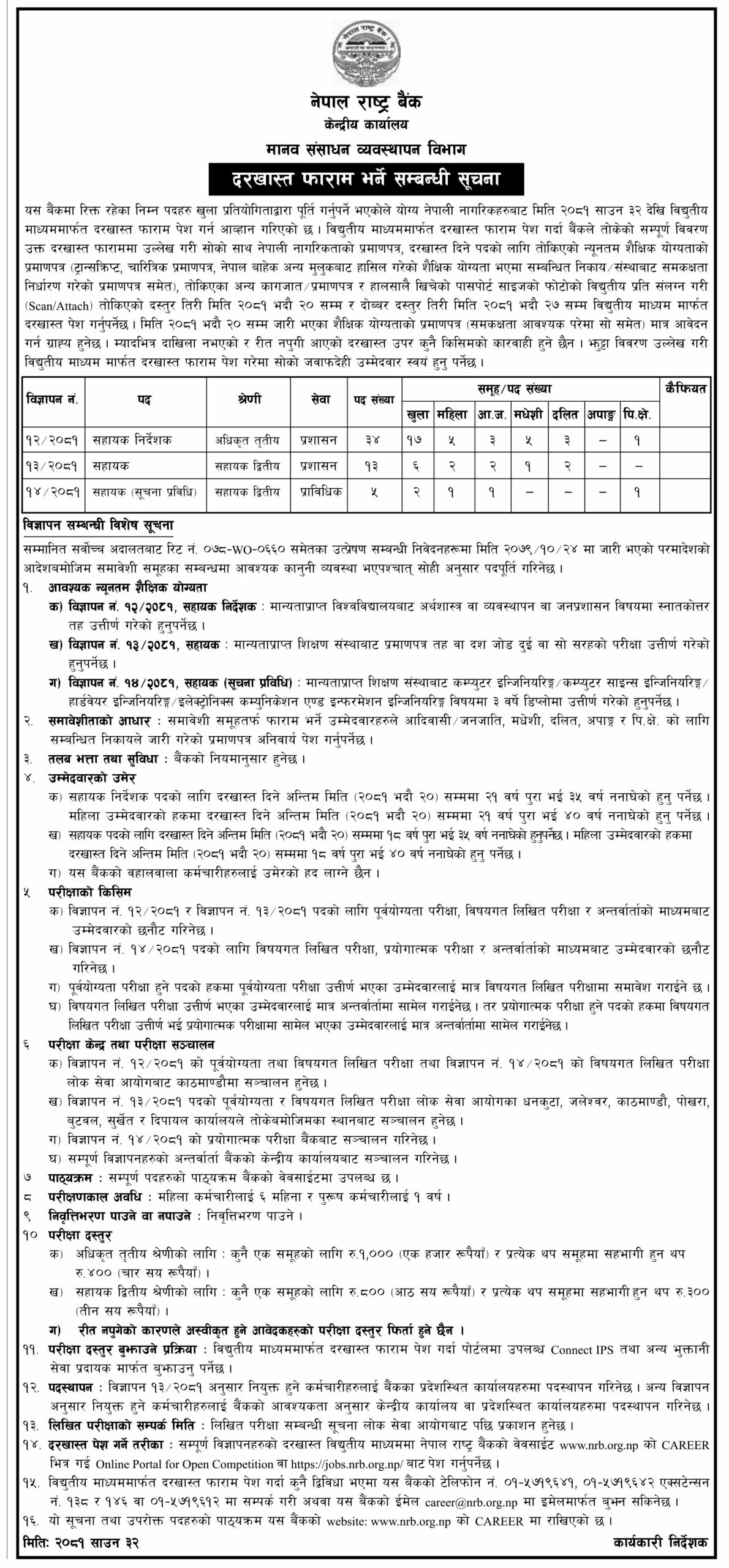 बैंकमा रिक्त रहेका पदहरू खुला प्रतियोगिताद्वारा पूर्ति गर्नुपर्ने भएकोले योग्य नेपाली नागरिकहरूबाट मिति २०८१ साउन ३२ देखि विद्युतीय माध्यममार्फत दरखास्त फाराम पेस गर्न आव्हान गरिएको छ ।