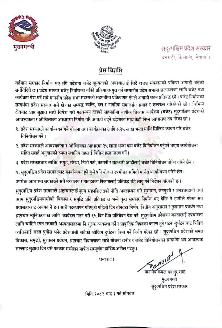 प्रदेश सरकारबाट व्यक्ति, समूह, संस्था, निजी फर्म, कम्पनी र सहकारीलाई बजेट तोकेर विनियोजन नगर्ने जारी विज्ञप्तिमा उल्लेख छ। साथै प्रदेश सरकारबाट कार्यान्वयन हुने कुनै पनि योजना उपभोक्ता समितिमार्फत गरिने आधार तय भएको मुख्यमन्त्री शाहले बताए।