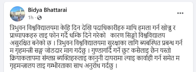 उनले सामाजिक सञ्जाल फेसबुकमा स्टाटस लेख्दै गृहमन्त्रीलाई सुरक्षा प्रबन्ध मिलाइदिन माग गरेकी हुन् । मन्त्री भट्टराईले लेखेकी छिन्, ‘त्रिभुवन विश्वविद्यालयमा सुरक्षाका लागि व्यवस्थित प्रबन्ध गर्न म गृहमन्त्रीसँग जोडदार माग गर्दछु ।’