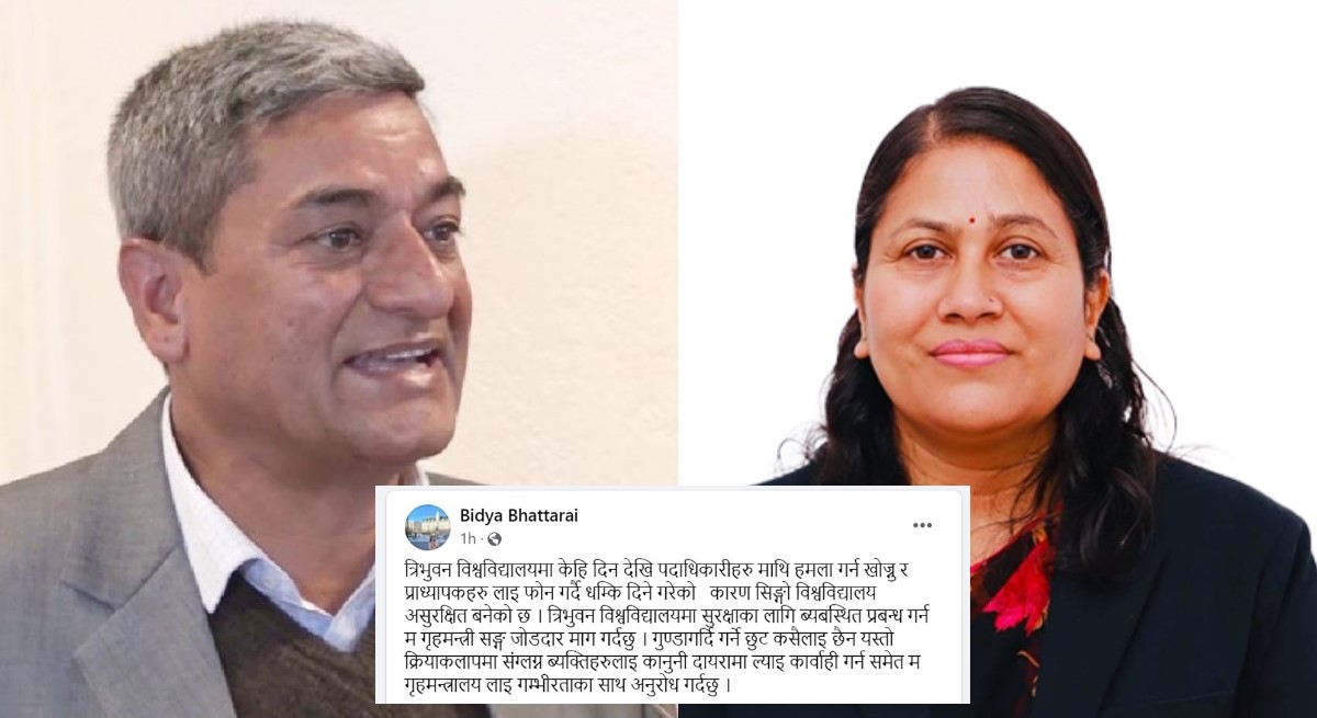काठमाडौँ – त्रिभुवन विश्वविद्यालय असुरक्षित भएको भन्दै शिक्षा, विज्ञान तथा प्रविधि मन्त्री विद्या भट्टराईले गृहमन्त्रीसँग सुरक्षा प्रबन्धको माग गरेकी छिन् । त्रिभुवन विश्वविद्यालयमा केही दिनदेखि पदाधिकारीहरूमाथि हमला गर्न खोज्नु र प्राध्यापकहरूलाई फोन गर्दै धम्की दिने गरेका कारण विश्वविद्यालय असुरक्षित बनेको मन्त्रीको भनाइ छ ।