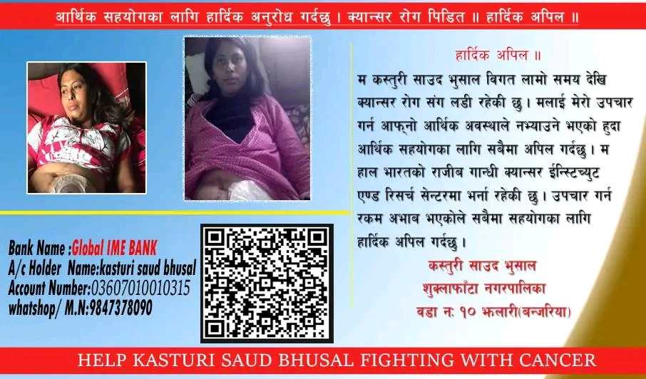 कञ्चनपुर – क्यान्सरपीडित कस्तुरी साउद भुसालले आफ्नो जीवन बचाइदिन देश-विदेशमा रहेका सबै नेपालीसामु अपिल गरेकी छिन्। कञ्चनपुरको शुक्लाफाँटा नगरपालिका वडा नं १० झलारी स्थायी घर भएकी ३५ वर्षीया कस्तुरी विगत ८ वर्षदेखि कोलोन क्यान्सरबाट (ठुलो आन्द्राको) पीडित छिन्।