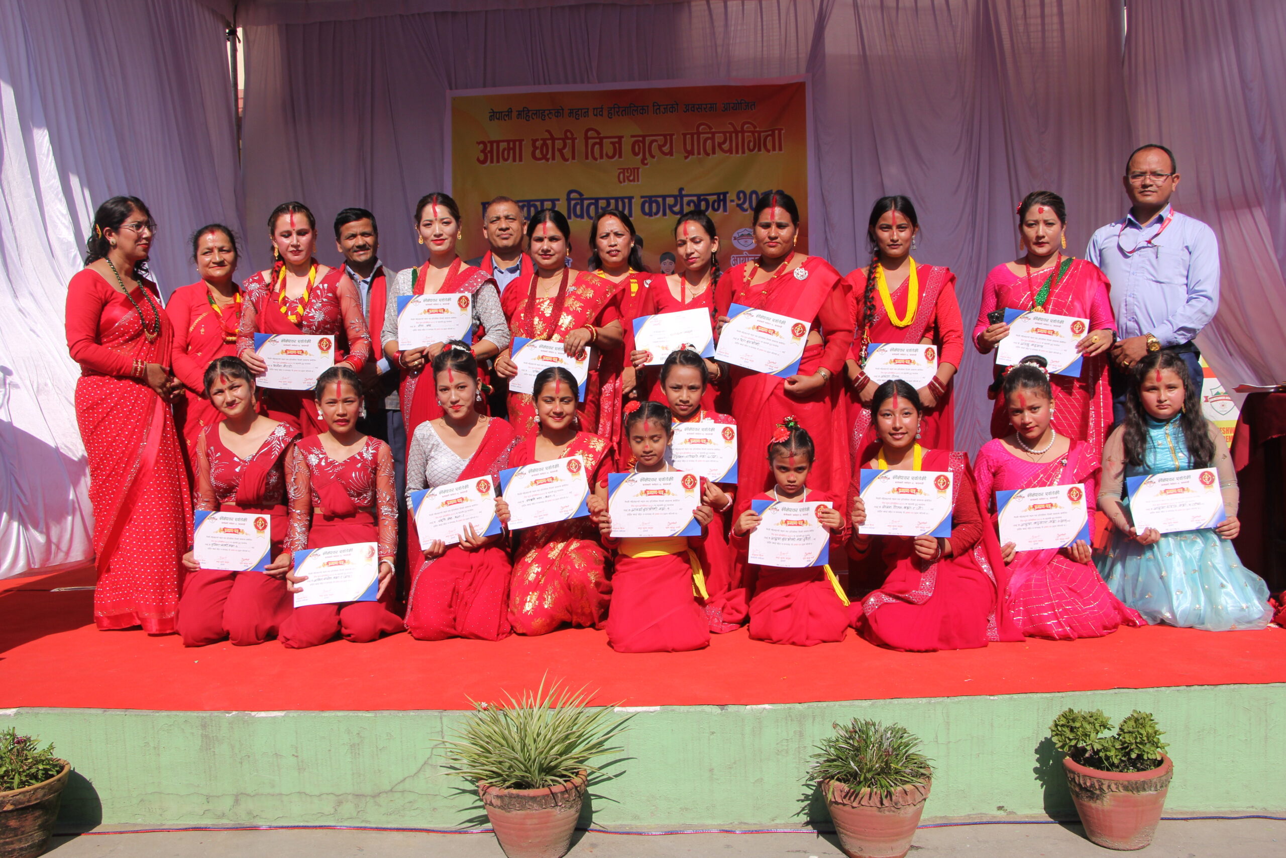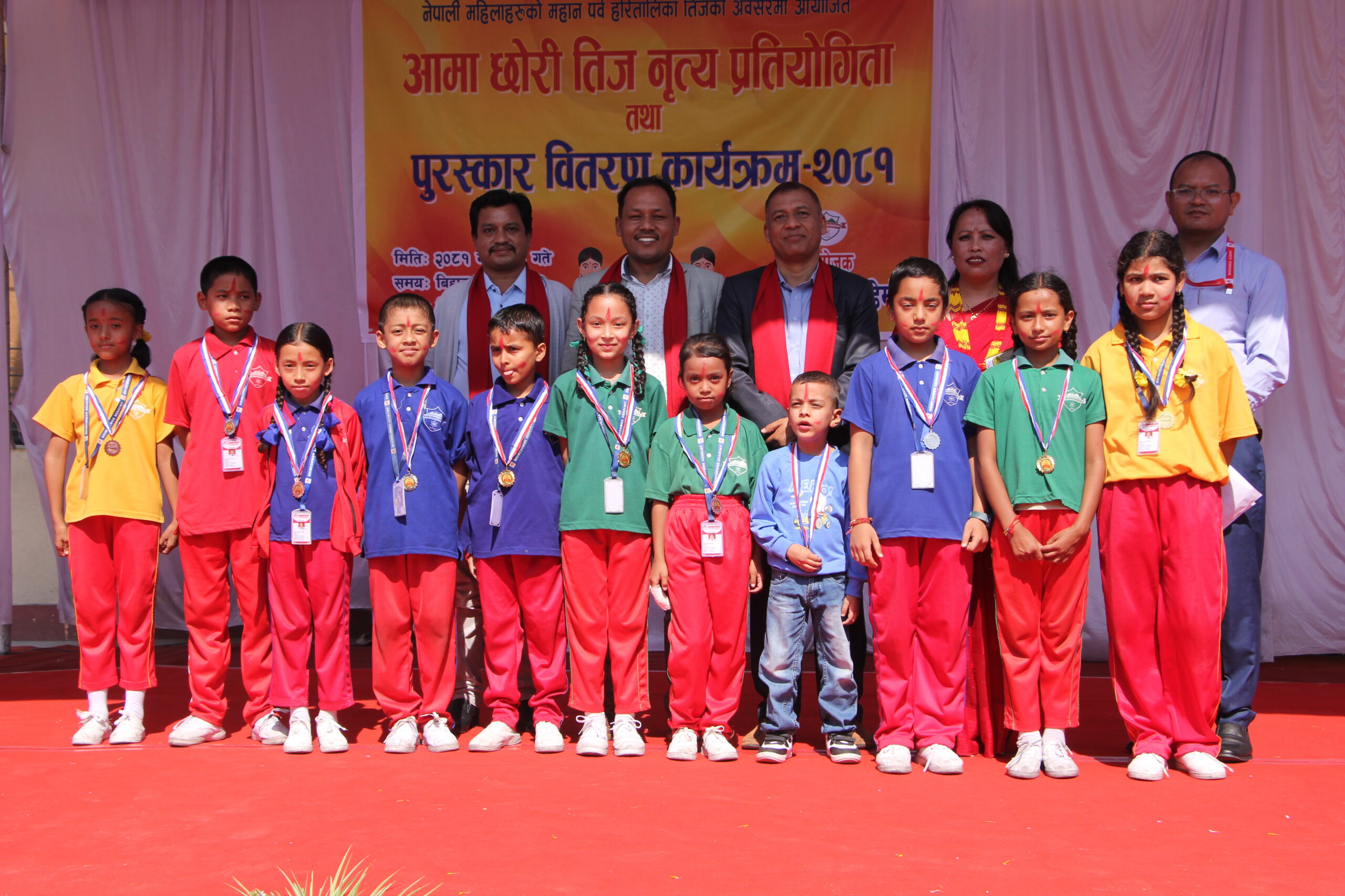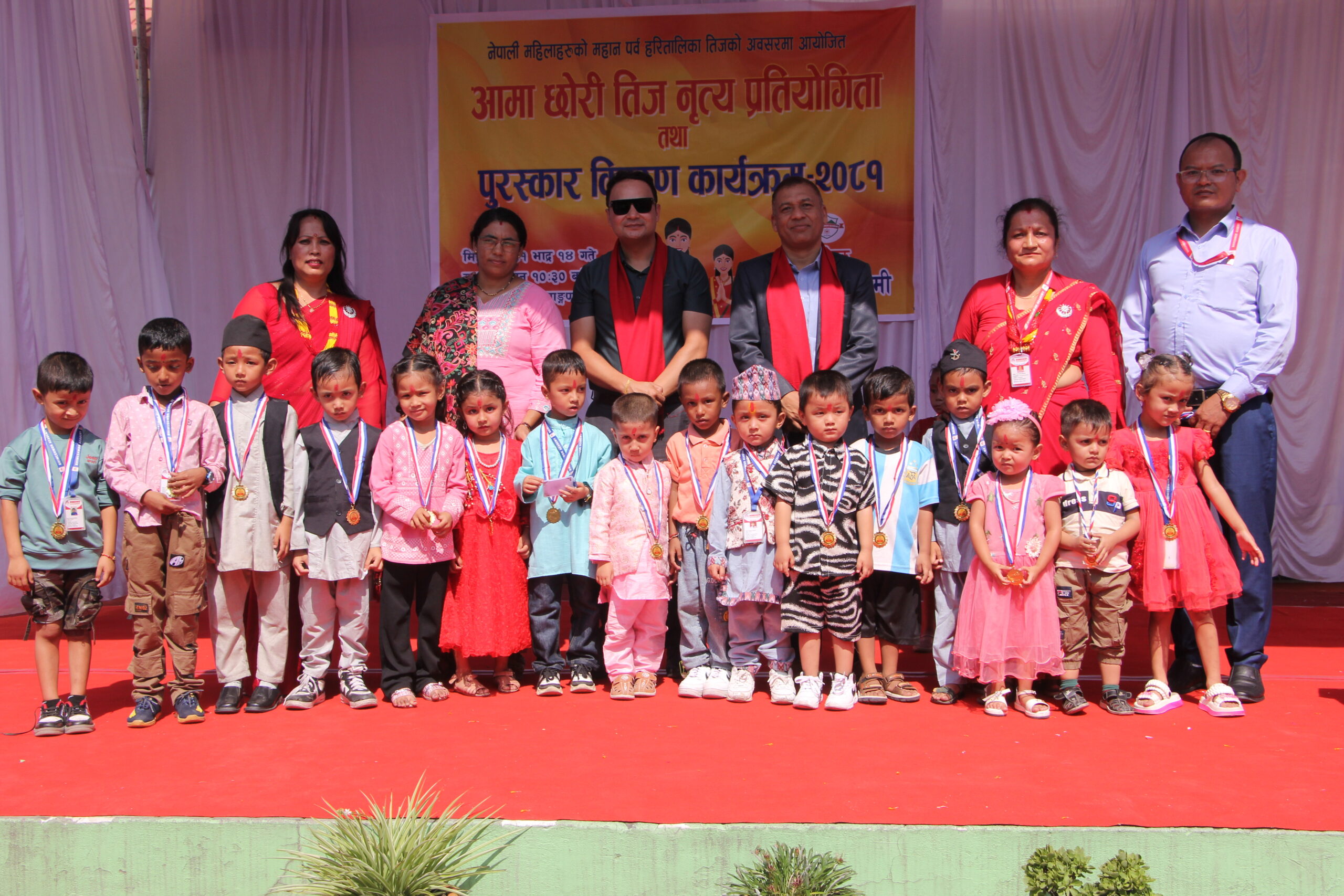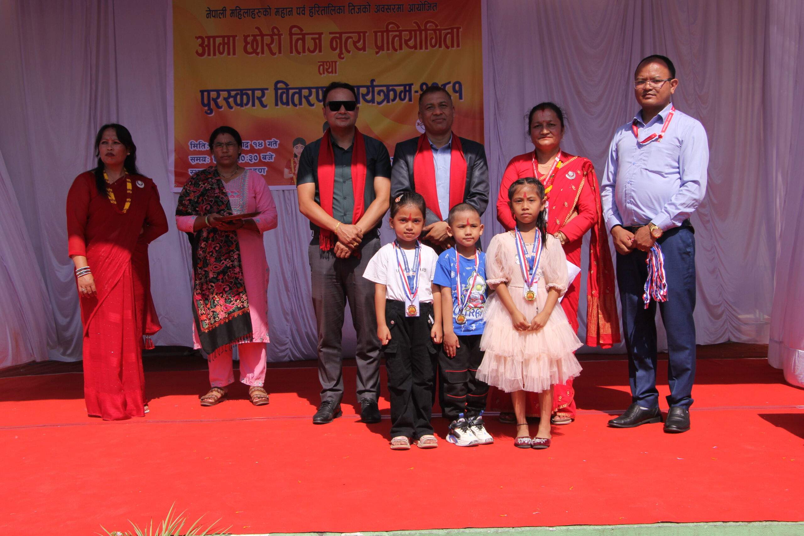 काठमाडाैं – भीमेश्वर स्कुलले आमा छोरी तिज नृत्य प्रतियोगिता भव्यताका साथ सम्पन्न भएको छ । कागेश्वरी मनोहरा नगरपालिका वडा नम्बर ९ गोठाटारमा रहेको भीमेश्वर एकेडेमीले गत बर्षझै यस बर्ष पनि आमा छोरी तिज प्रतियोगिता आयोजना गरेको छ । प्रतियोगितामा प्रथम, द्वितीय र तृतीय हुने आमाछोरीलाई प्रमाण पत्र तथा नगदसहित सम्मान गरेको छ भने चौथो हुने आमा छोरीलाई सान्त्वना स्वरुप नगद प्रदान गरेको विद्यालयका प्रिन्सिपल अमृत कुमार खड्काले बताउनुभयो ।