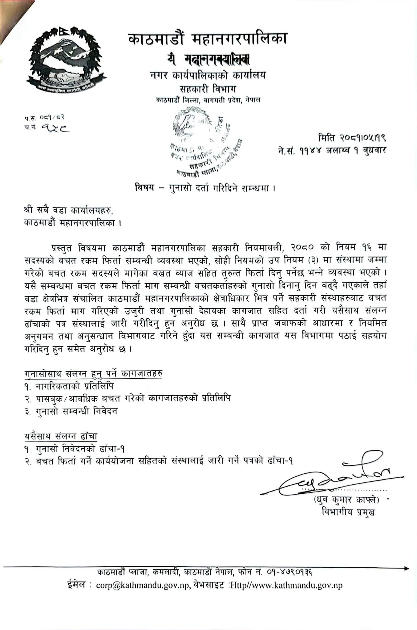 सूचनामा भनिएको छ- ‘यसै सम्बन्धमा बचत रकम फिर्ता माग सम्बन्धी बचतकर्ताको गुनासो दिनानु दिन बढ्दै गएकाले तहाँ वडा क्षेत्रभित्र सञ्चालित काठमाडौं महानगरपालिकाको क्षेत्राधिकारभित्र पर्ने सहकारी संस्थाहरूबाट वचत रकम फिर्ता माग गरिएको उजुरी तथा गुनासो देहायका कागजात सहित दर्ता गरी यसैसाथ संलग्न ढाँचाको पत्र संस्थालाई जारी गरीदिनु हुन अनुरोध छ ।’