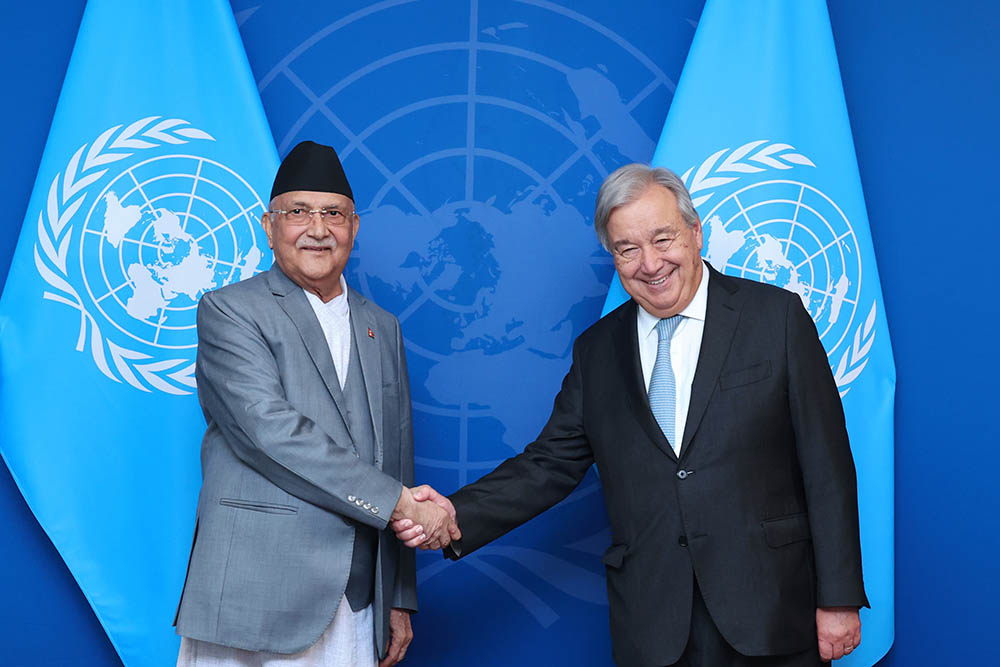 संयुक्त राष्ट्रसङ्घको ७९औँ महासभामा सहभागी हुन संयुक्त राज्य अमेरिकाको न्युयोर्कमा रहेका प्रधानमन्त्री ओली र राष्ट्रसङ्घका महासचिव गुटेरेसबीच स्थानीय समयअनुसार शनिवार साँझ राष्ट्रसङ्घ भवनमा भेटवार्ता भएको हो ।