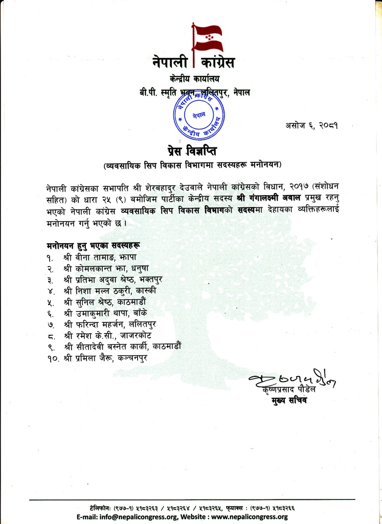 सभापति शेरबहादुर देउवाले पार्टीको विधान, २०१७ (संशोधन सहित) को धारा २५ (९) बमोजिम गंगालक्ष्मी अवाल प्रमुख रहेको व्यवसायिक सिप विकास विभागमा दश जना सदस्यलाई मनोनयन गरेका हुन् ।