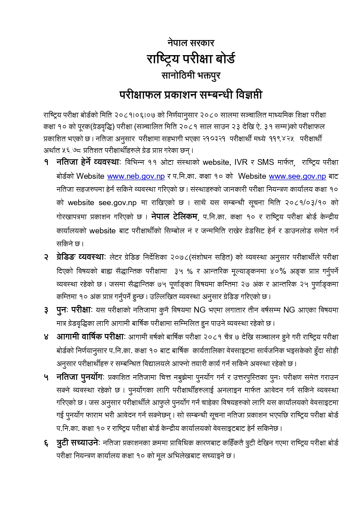 काठमाडौँ– राष्ट्रिय परीक्षा बोर्डले माध्यमिक शिक्षा परीक्षाको पूरक परीक्षा (ग्रेडवृद्धि) को नतिजा प्रकाशन गरेको छ। गत साउन महिनाको २३ गतेदेखि सञ्चालित पूरक परीक्षाको नतिजा बोर्डले सोमबार प्रकाशन गरेको हो।