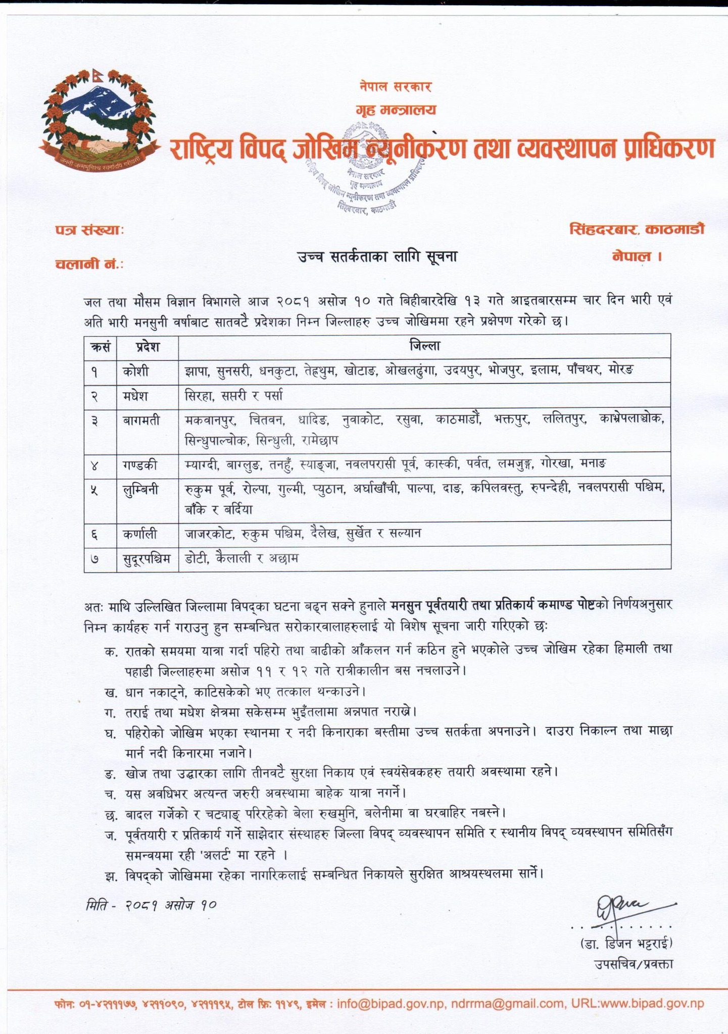 बिहीबारदेखि आइतबारसम्म चार दिन भारी वर्षा एवं अति भारी मनसुनी वर्षा हुने मौसम विभागले जनाएको छ ।  प्राधिकरणले धान नकाट्ने, काटिसकेको भए तत्काल थन्काउने, तराई तथा मधेस क्षेत्रमा भुइँतालमा अन्नपात नराख्ने, पहिरो जोखिम भएका स्थानमा र नदी किनारा बस्तीमा उच्च सतर्कता अपनाउन र दाउरा निकाल्न तथा माछा मार्न नदी किनारामा नजाने सूचना जारी गरेको छ ।